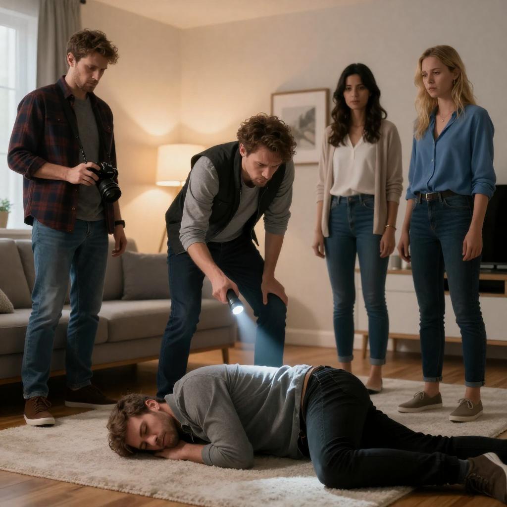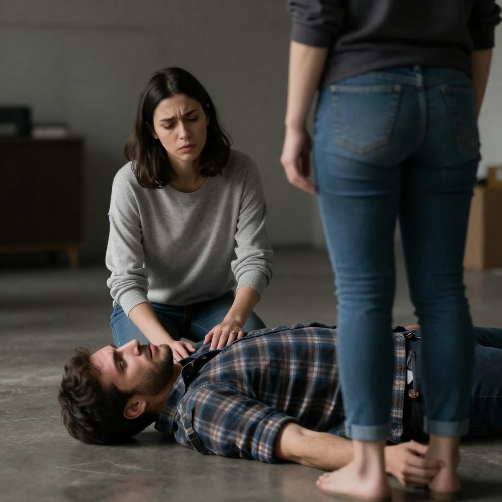 Photograph of three people in a dimly lit room. Woman with dark hair, wearing a grey sweater, kneels beside a man lying on the floor, looking worried. Another woman with dark hair, standing, looks down at the man. Man wears a plaid shirt. Man's face shows pain. Woman in jeans stands with back to camera. Concrete floor and blurred background.