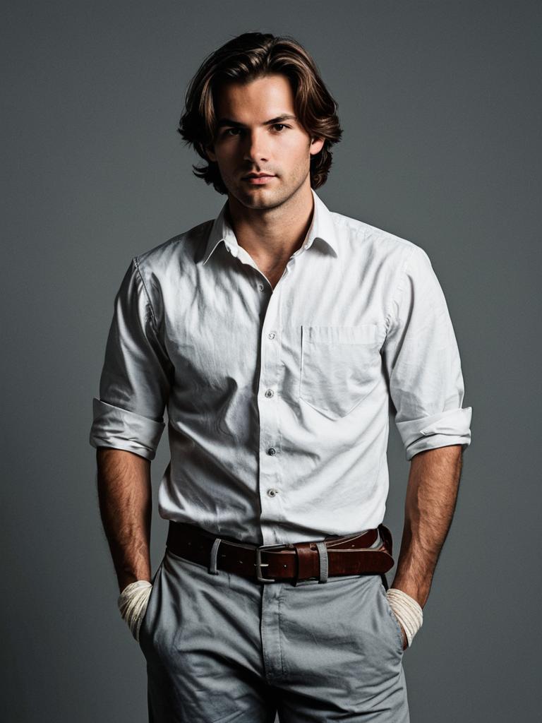 Photograph of a handsome Caucasian man with wavy brown hair and light stubble, standing against a dark gray background. He is wearing a crisp white button-up shirt with sleeves rolled to his elbows, light gray pants, and a brown leather belt. His hands are casually in his pockets, with white gloves visible on his right hand. His expression is serious and slightly intense. The lighting highlights his facial features and shirt, creating a slight shadow behind him. The image has a modern, professional studio-style aesthetic.