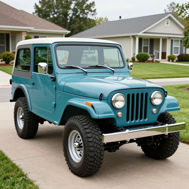 Classic 1965 Jeep CJ-5 parked in a suburban driveway, showcasing its teal paint, chrome accents, and rugged off-road tires against a backdrop of neatly trimmed lawns and residential houses.