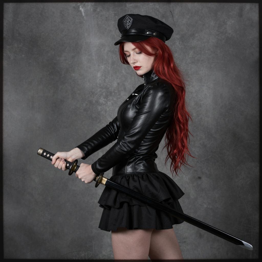 Woman with long red hair in black leather jacket and hat, holding a katana, wearing a black gothic dress. She stands against a concrete wall, looking up with intense expression. Background has a rough, dark border. Photograph.