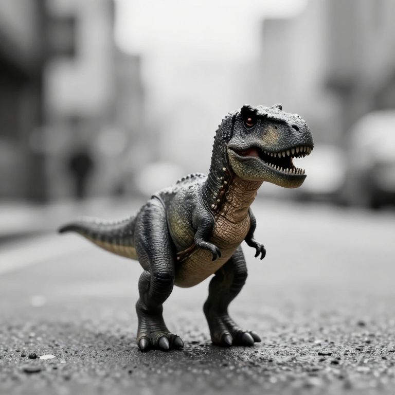 A photograph of a small, detailed plastic dinosaur figurine resembling a Velociraptor, standing on a gray, textured asphalt street. The dinosaur has a green and brown scaly texture with a dark green back and a lighter brown underbelly. Its mouth is open, revealing sharp teeth, and its small claws are visible on its feet. The background is blurred, featuring indistinct urban elements like buildings and a bright, overexposed sky. The image uses selective color, highlighting the dinosaur in vivid detail while the background is in grayscale, drawing focus to the figurine.