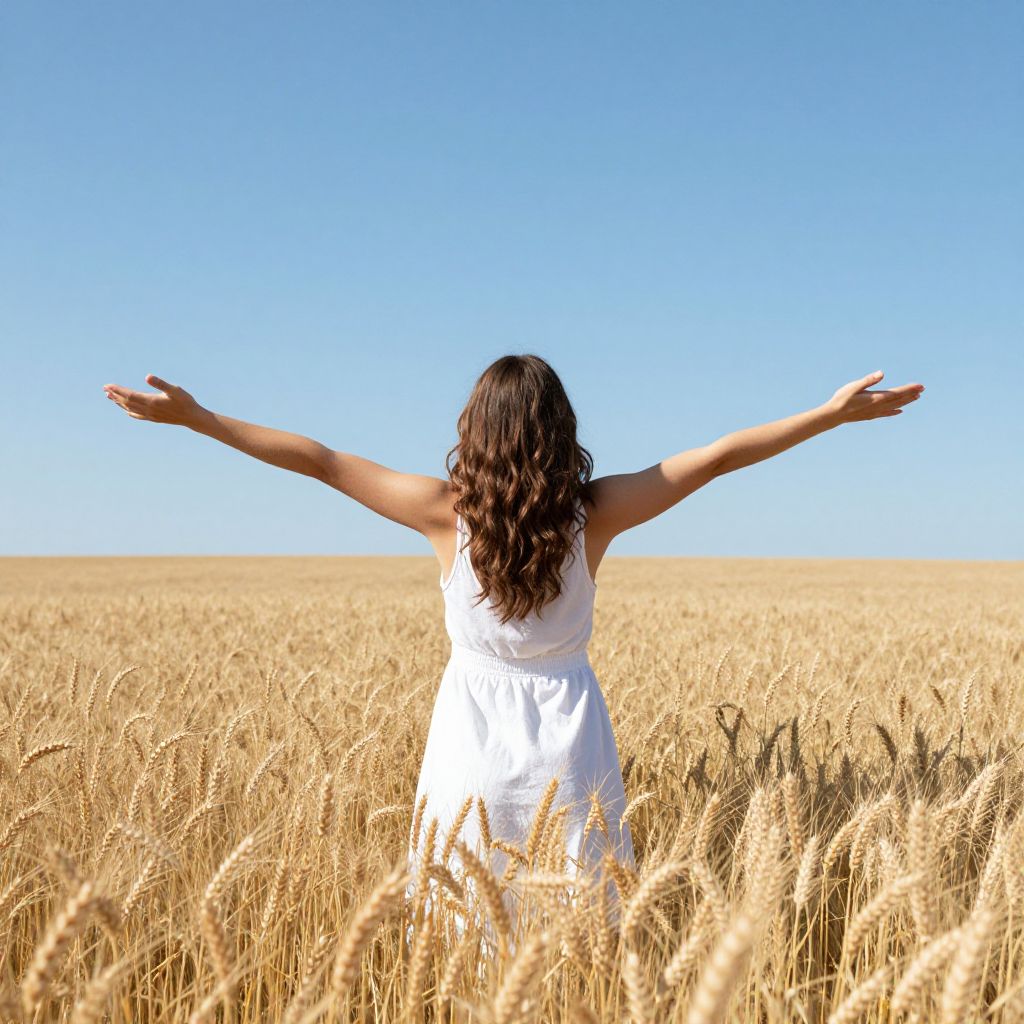 Photograph of a woman with long, wavy brown hair standing in a golden wheat field under a clear blue sky. She is facing away from the camera with her arms outstretched in a V-shape, wearing a sleeveless white dress. The wheat stalks are tall and dense, reaching up to her waist. The bright sunlight casts soft shadows, highlighting the texture of the wheat and the smooth fabric of her dress. The horizon is a straight line, emphasizing the vastness of the field. The image conveys a sense of freedom and connection with nature.