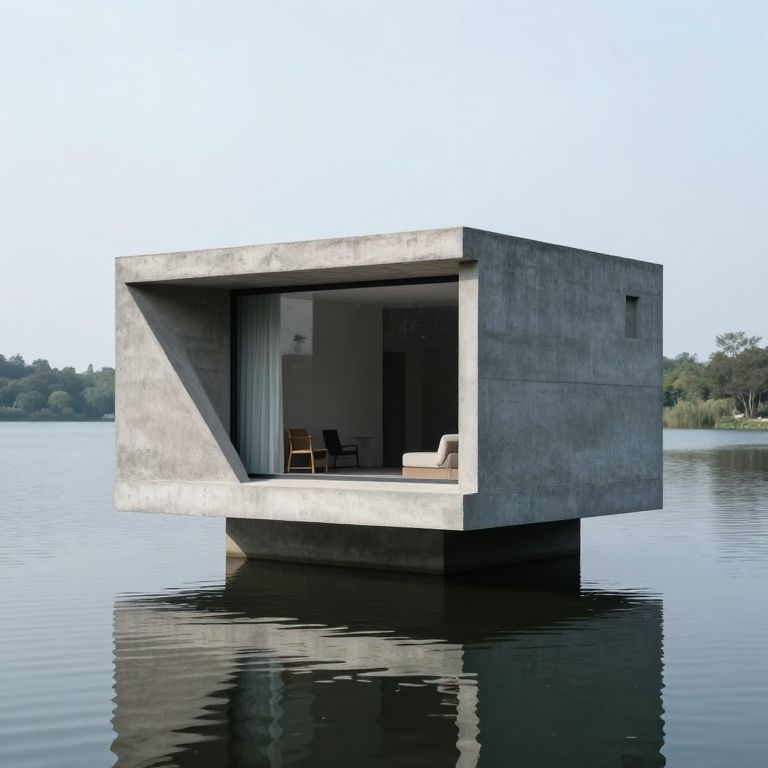 Brutalist tiny house floating on stilts above a calm lake, constructed from rough concrete with sharp edges and minimalist design, reflective water surface, cool muted colors, sparse interior decor focused on functionality and comfort, blending architecture and nature.