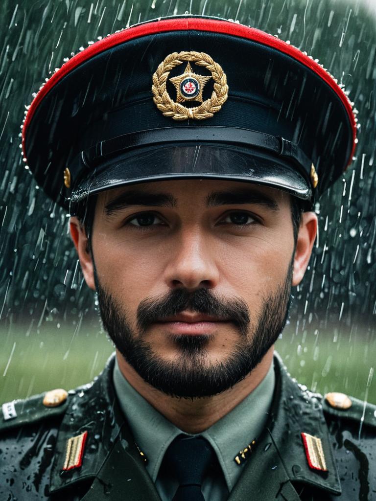 Portrait of a young man with a beard and mustache wearing a dark green military uniform and a peaked cap with red trim and gold insignia, standing in the rain. The soldier looks directly at the camera with a serious expression, raindrops visible on his uniform and hat.