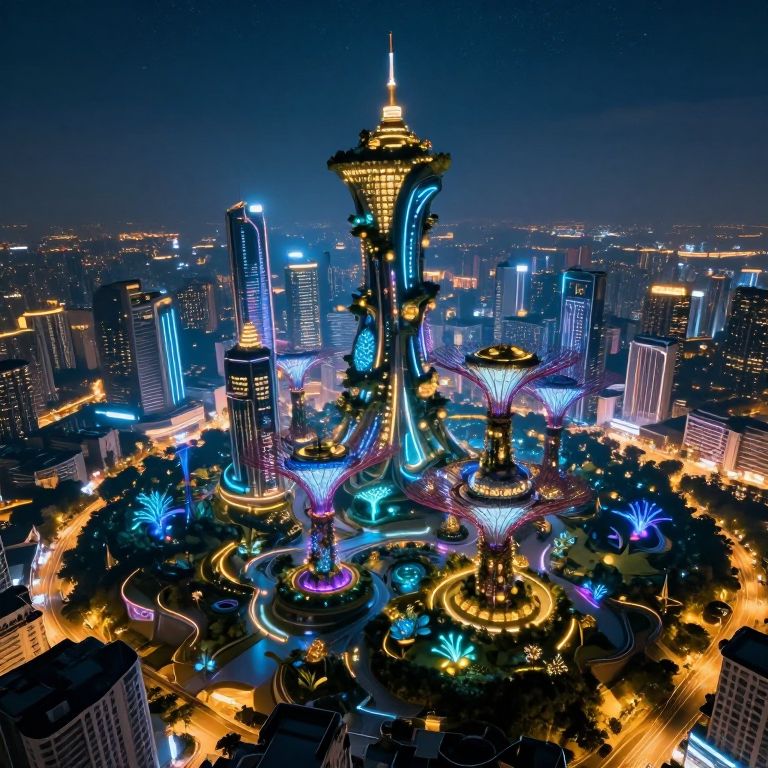 Photograph of a vibrant, nighttime cityscape featuring a central, futuristic, illuminated tower with a spire, surrounded by glowing, blue, purple, and white lights. The tower is flanked by tall, neon-lit skyscrapers. The base of the tower is adorned with ornate, glowing structures resembling lotus flowers. The background reveals a sprawling city with countless illuminated buildings and streets. The sky is dark, contrasting with the bright, colorful lights below. The overall scene is futuristic and energetic, showcasing a blend of modern architecture and dazzling light displays.