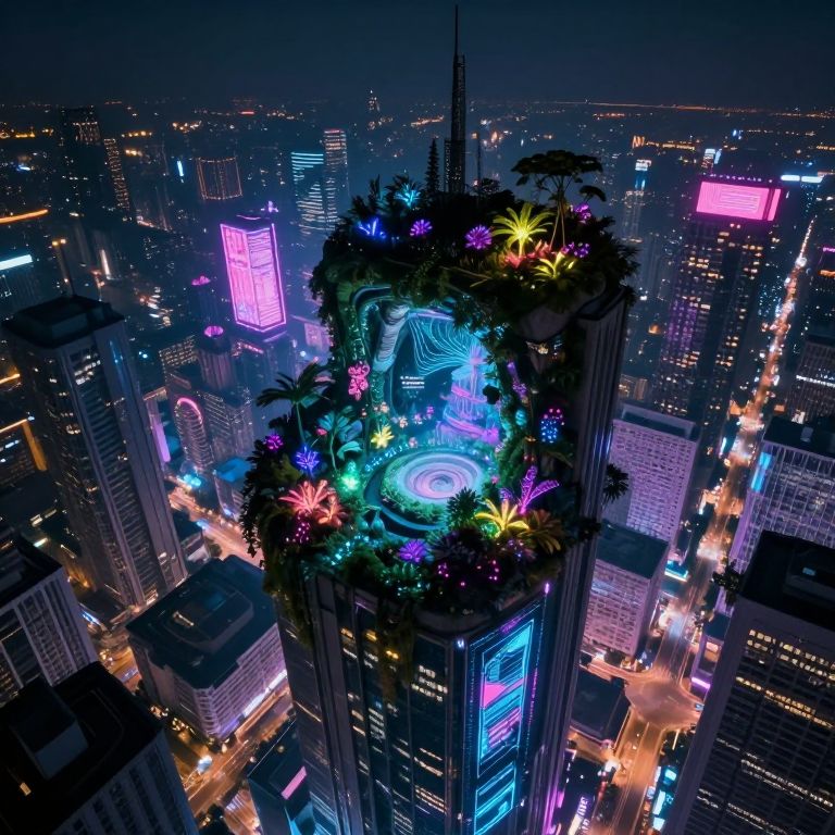 A futuristic metropolis emerges from an aerial vantage point, showcasing a harmonious fusion of advanced architecture with natural forms reminiscent of a thriving biosphere. Neon lights traverse the skyline in a captivating display of vibrant hues, their luminescence reflecting on towering edifices that seem to sprout organically from the earth beneath. This distinctive amalgamation of science fiction and ecological splendor breathes life into the cityscape as bioluminescent flora and fauna intermingle with polished metallic surfaces, crafting an awe-inspiring panorama that stirs a sense of marvel and curiosity. The scene is illuminated by otherworldly light, transitioning gracefully between cool azure tones cast by the starlit heavens to warm golden shades radiating from the city's core, painting a mesmerizing tableau of equilibrium between nature and technology.