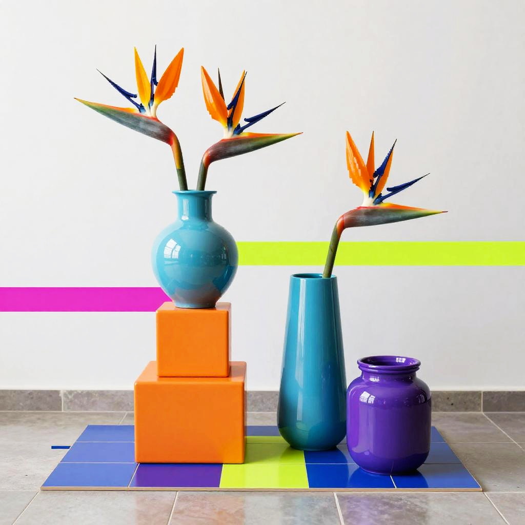 A digital glitch art with pixel distortion and neon highlights of exotic birds of paradise flowers housed in metallic cyan vases and stacked orange square pots with glossy violet jars. Set against disrupted horizontal bars mixing fuchsia, lime, and steel blue on abstract tile surfaces on a tiled floor. Playful modern still life, Memphis-inspired geometry, saturated yet balanced color, clean negative space, high detail, crisp edges, soft studio lighting, cohesive composition.