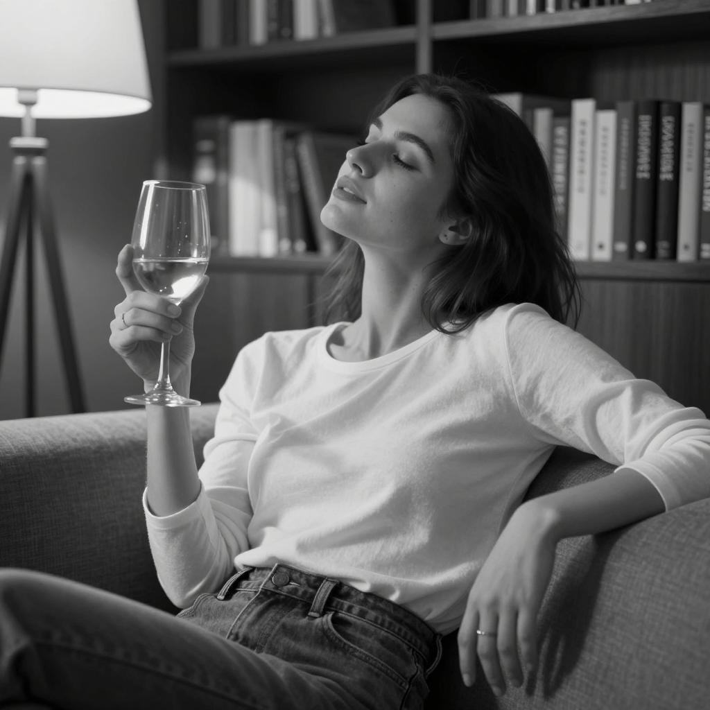Woman with long brown hair, black short-sleeve top, gray skirt, standing in laundry room, holding white cordless phone, pouring white wine into glass on top of black washing machine. White tiled wall, metal shelf with wine bottle and basket, framed poster on wall, white front-loading washer.