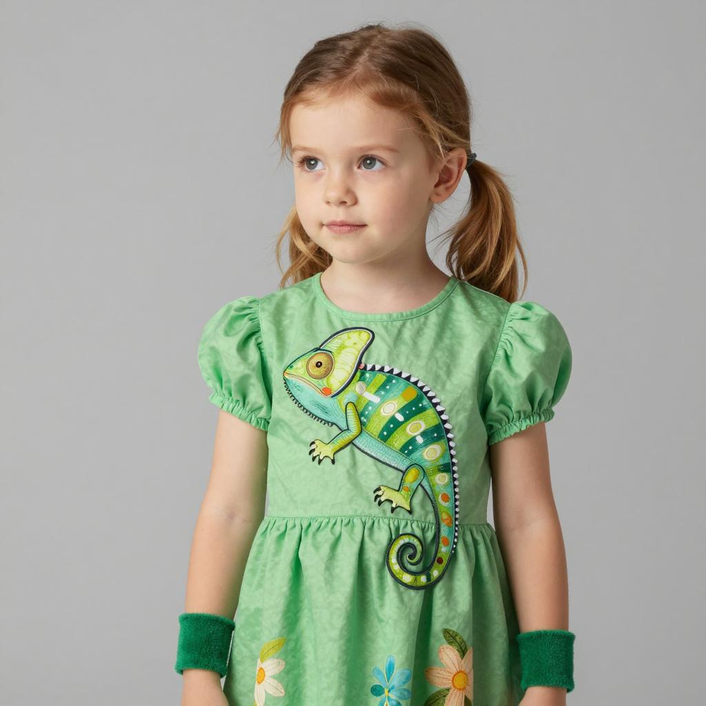 Portrait of a toddler girl with light brown hair in pigtails wearing a green dress featuring a realistic chameleon applique and floral designs. The dress has puffed sleeves and she wears matching green wristbands. The child stands against a plain gray background looking slightly to the left with a neutral expression. Studio lighting highlights the detailed textures and colorful, whimsical attire.