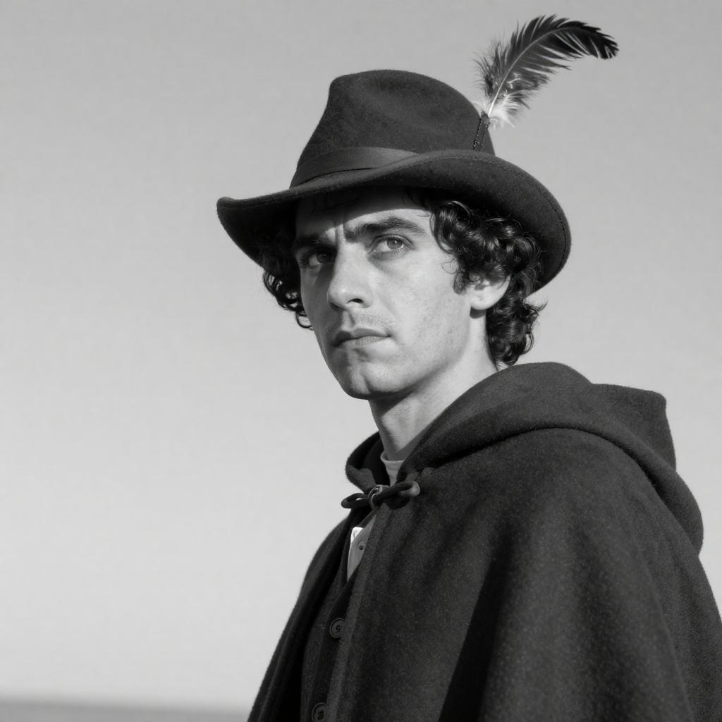 Black-and-white photograph of a man with curly dark hair, wearing a dark hat with a feather, intense expression, looking to the side. He has a ured, dark-colored cloak over his shoulder. Background is plain and light gray.