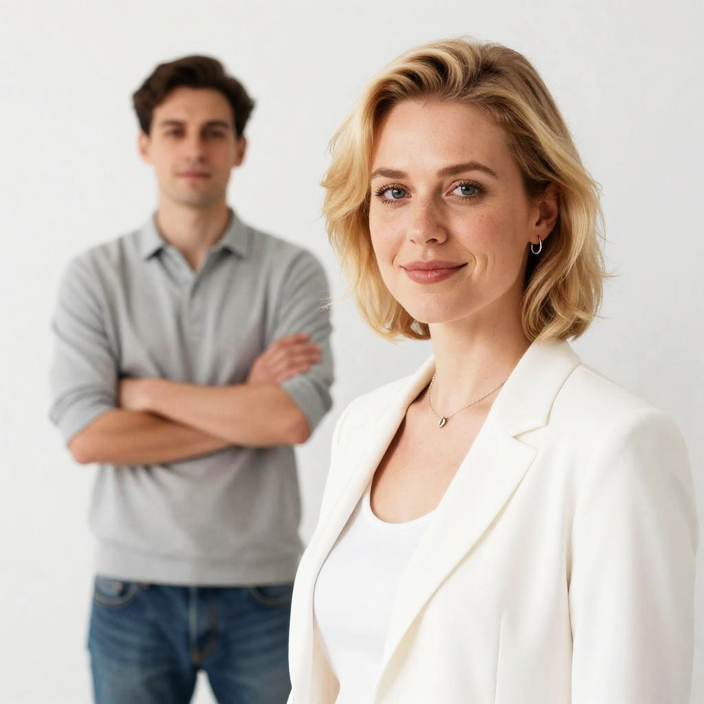 Photograph of two people in a classroom. Blonde woman with straight hair, serious expression, wearing red shirt and black jacket, facing man with short dark hair, wearing checkered shirt. Chalkboard and colorful drawings in the background. Man's back to camera. Woman's right side visible. Intense interaction.