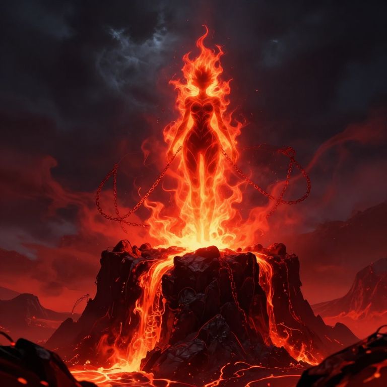 Digital artwork of a towering, fiery mountain with glowing red lava, chains, and a burning figure at its peak against a dark, stormy sky.
