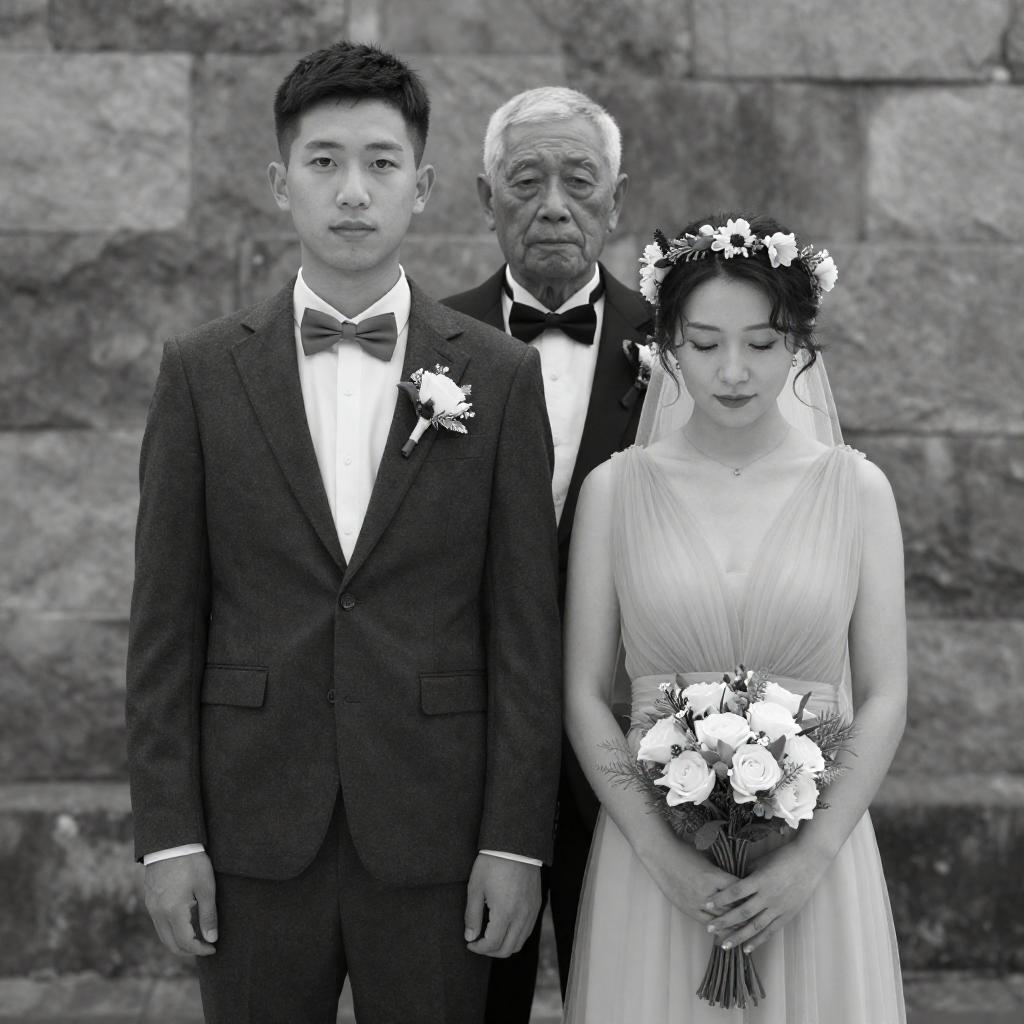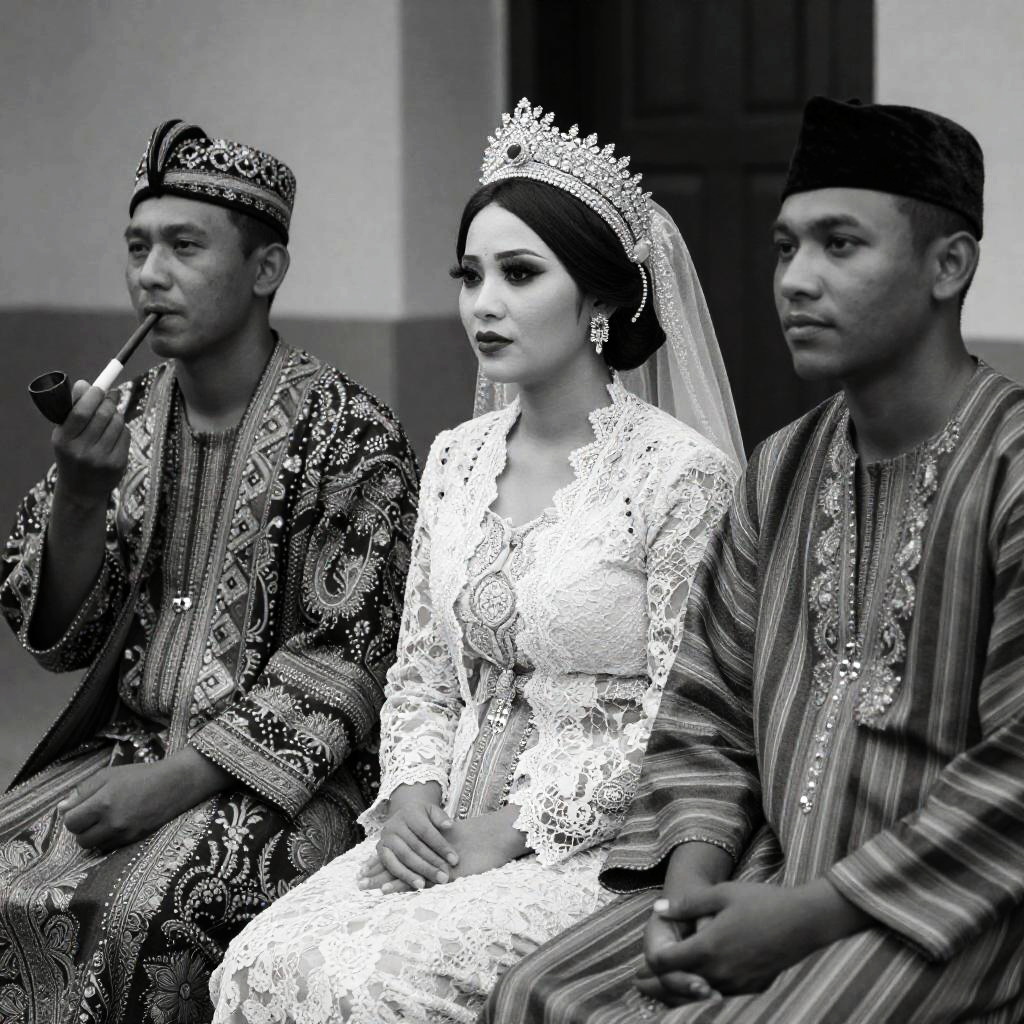 Black-and-white photograph of three people in ornate traditional clothing. Man on left with elaborate headpiece and patterned robe, holding a pipe. Woman in center with lace dress, elaborate headpiece, and dark makeup. Man on right in striped robe and black hat. All seated, facing slightly to the right. Woman's expression is neutral, men's expressions are calm.