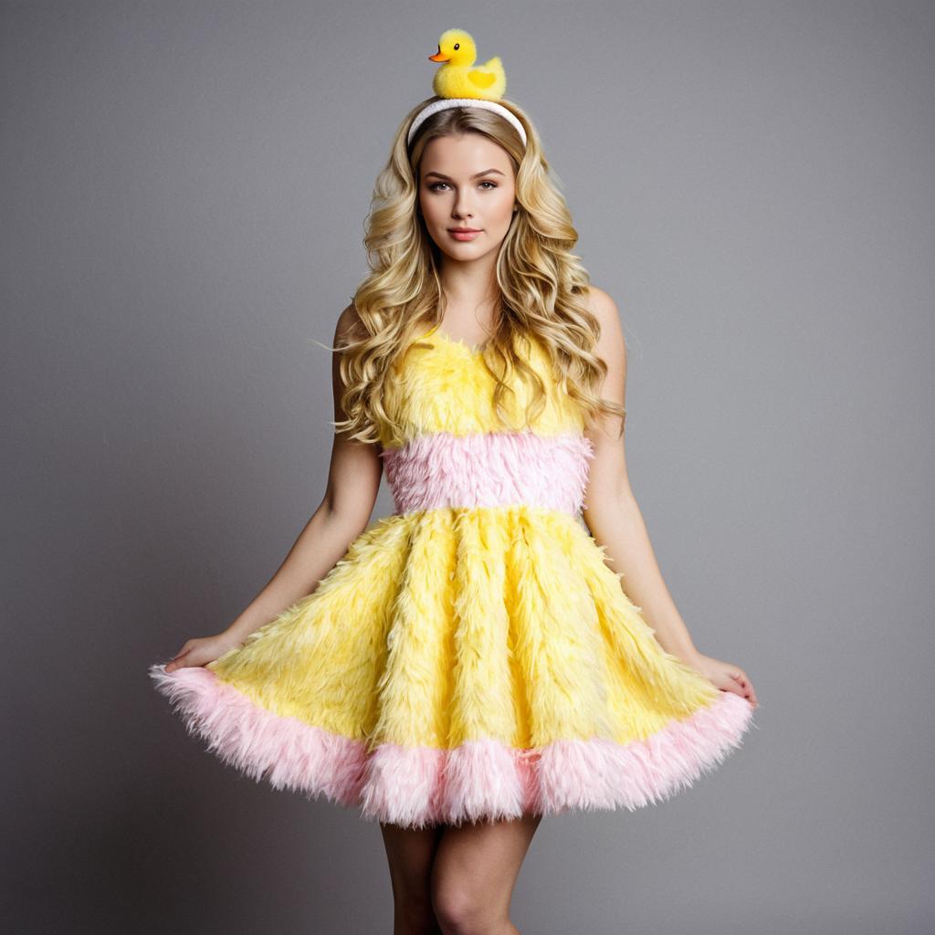 Easter chick fancy dress, photograph of a young blonde woman, wearing a pink and yellow fluffy dress, headband with yellow and white duck faces, long wavy hair, gray background, studio lighting, soft pastel colors, whimsical and playful style, standing pose, full body shot, fashionable and cute outfit