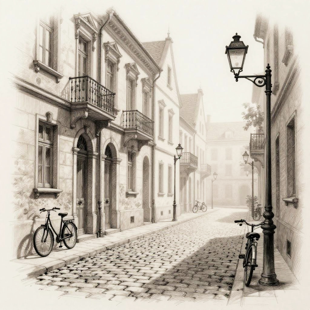 Images for sketching of urban scenes with intricate architectural details, cobblestone streets, street lamps casting shadows, bicycles leaning against walls, atmosphere of early morning fog, fine lines and cross-hatching emphasis.