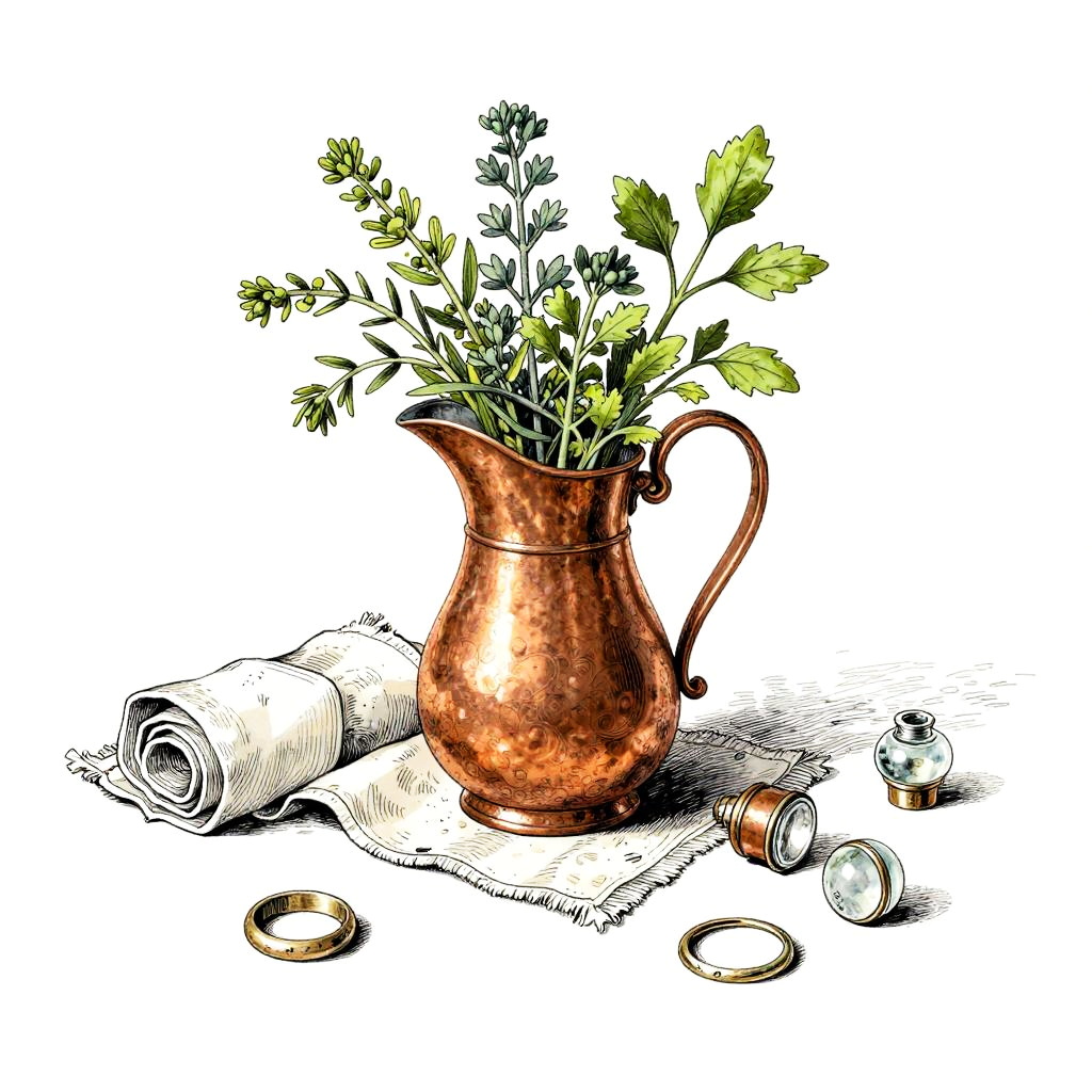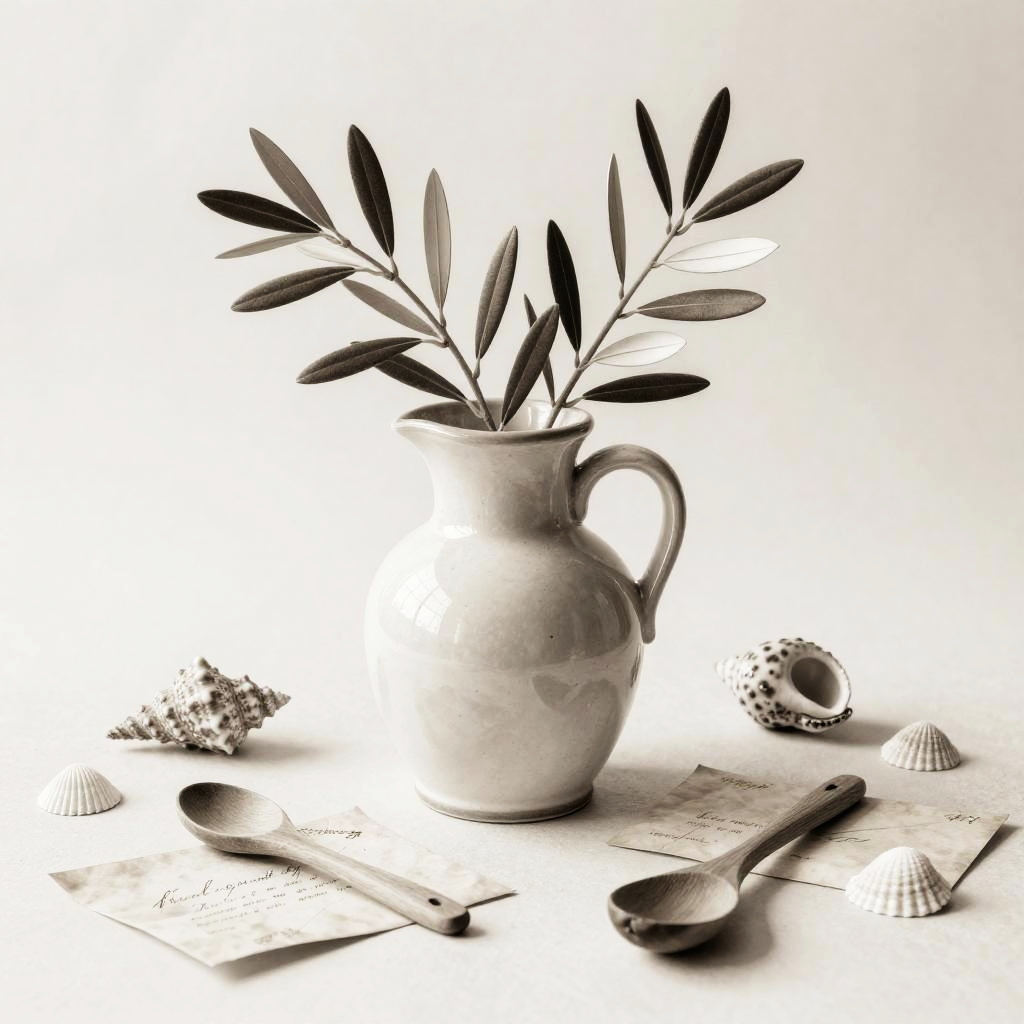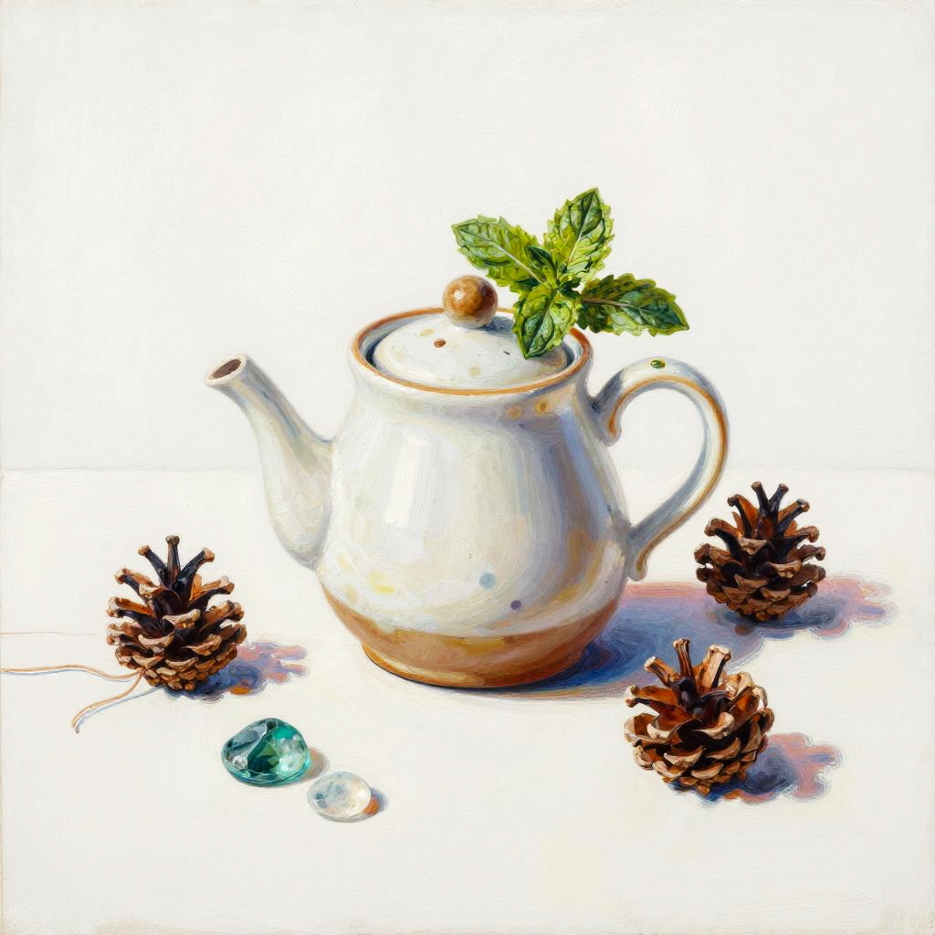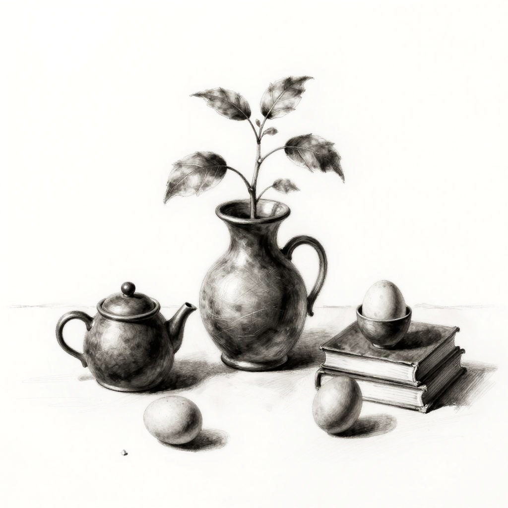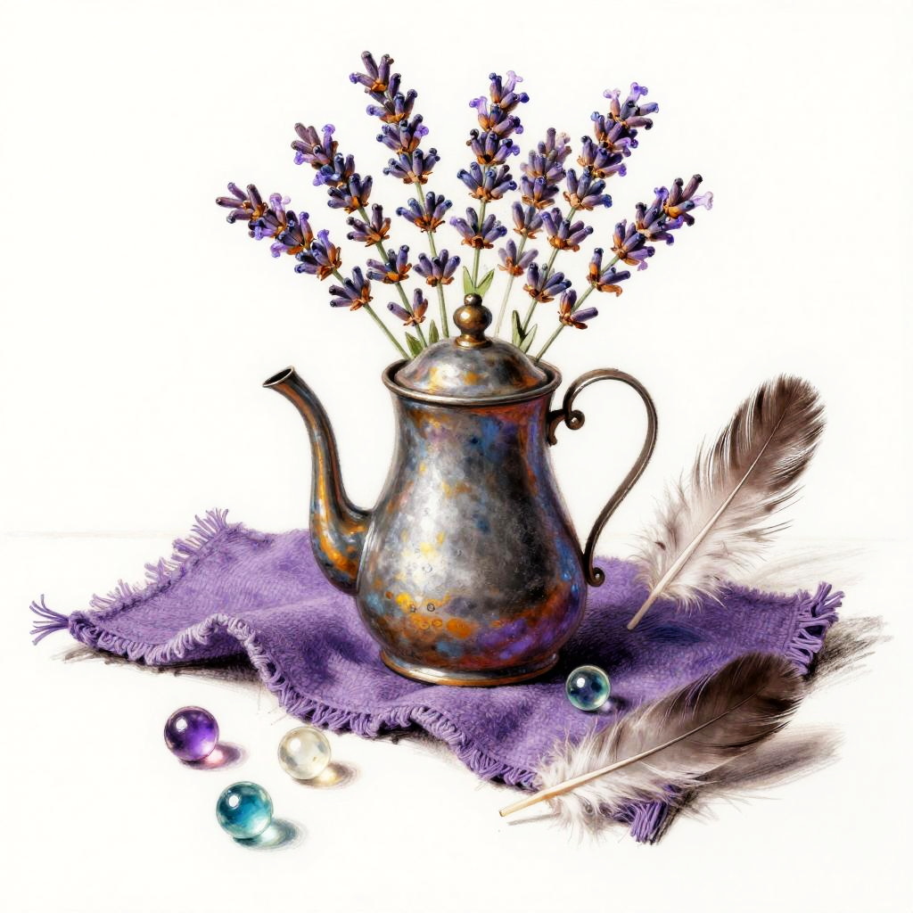 Whimsical still life rendered as a pastel drawing. At the center, a hand-thrown clay pitcher with orchids anchors the composition. Scattered around are feathers, old coins, tiny books, arranged playfully while keeping a clean backdrop, lively textures, soft cast shadows, balanced layout, charming details, handcrafted feel, and an inviting mood.