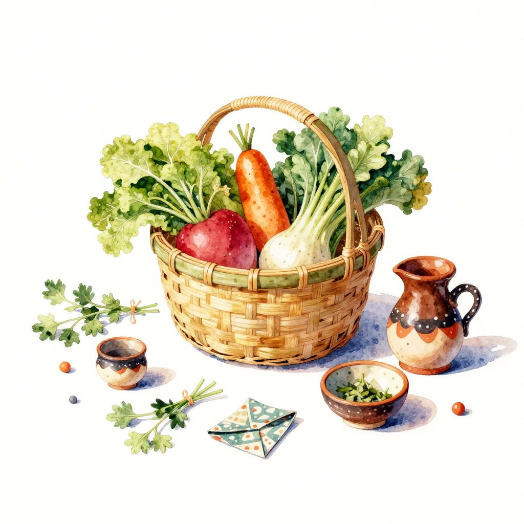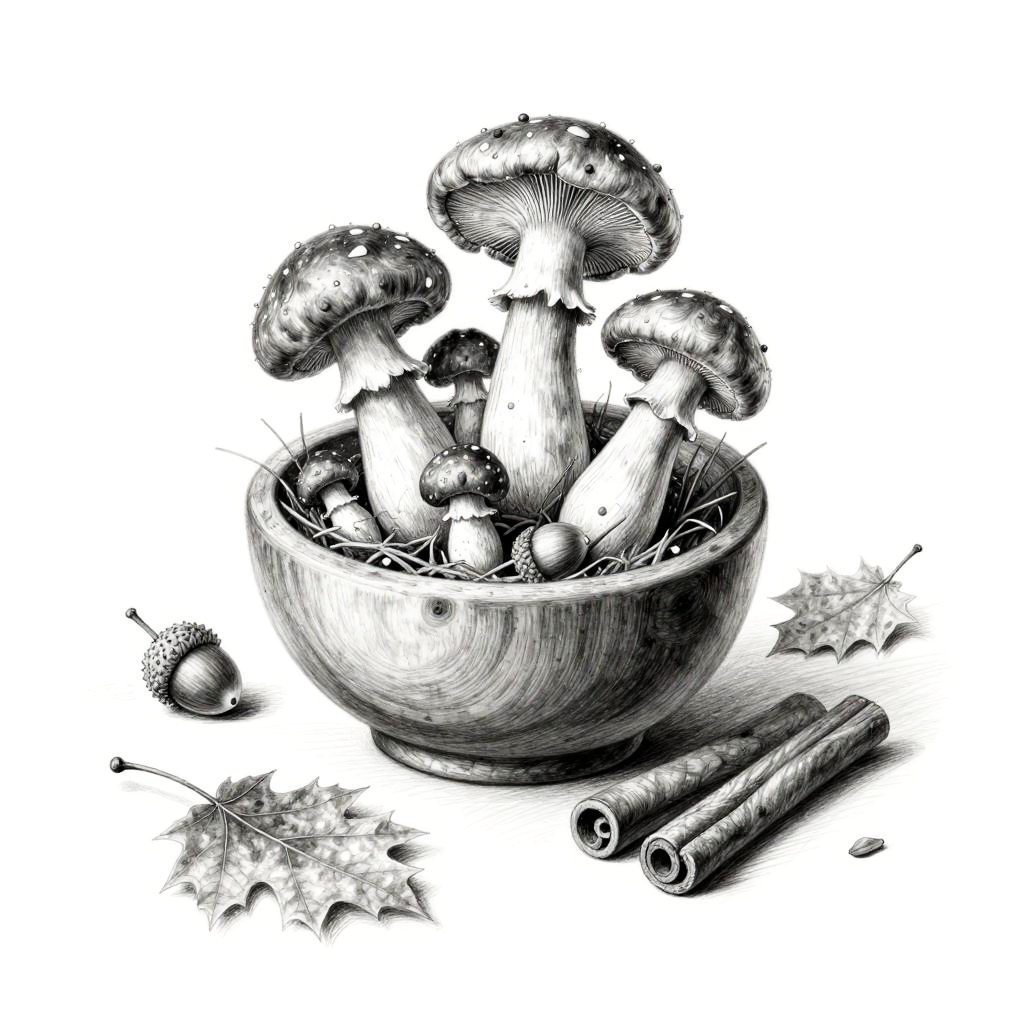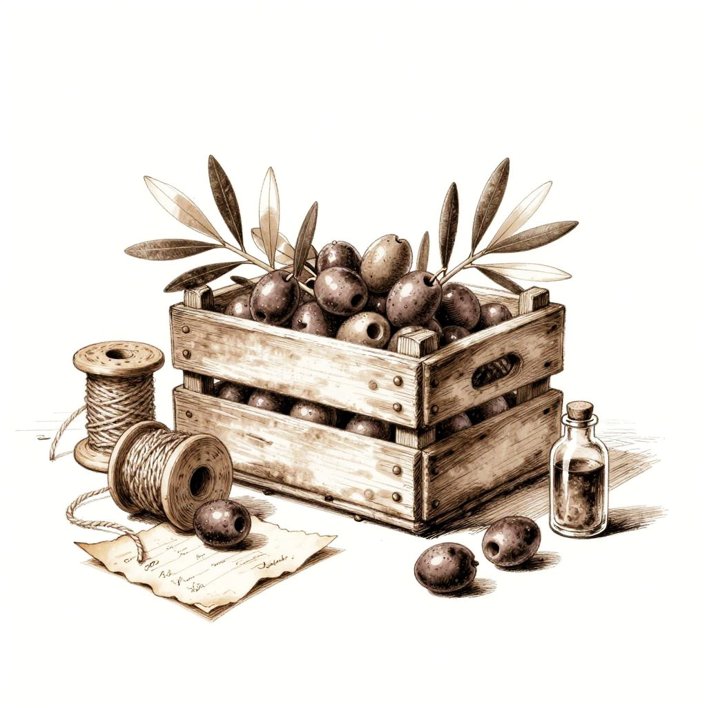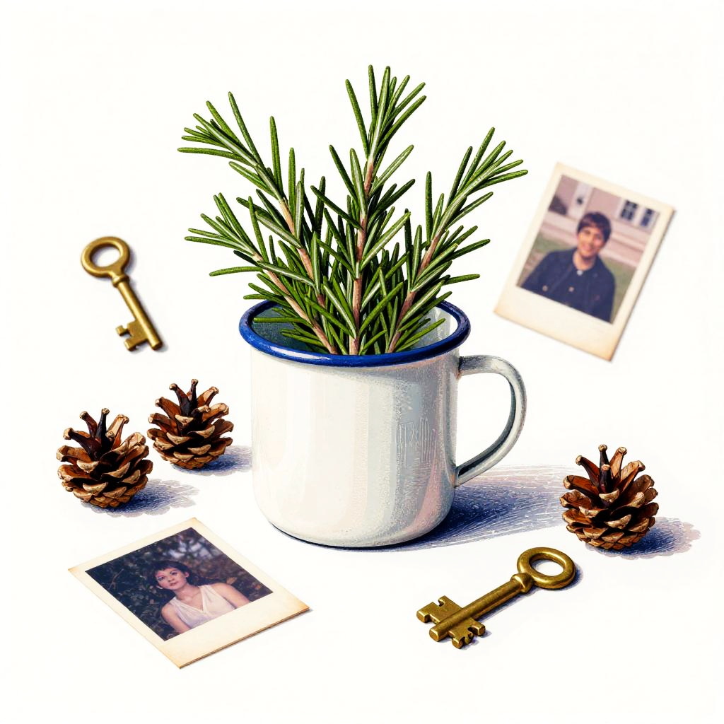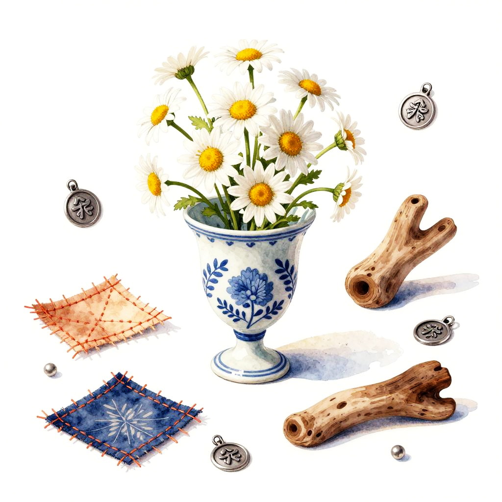 Whimsical still life rendered as a pastel drawing. At the center, a hand-thrown clay pitcher with orchids anchors the composition. Scattered around are feathers, old coins, tiny books, arranged playfully while keeping a clean backdrop, lively textures, soft cast shadows, balanced layout, charming details, handcrafted feel, and an inviting mood.