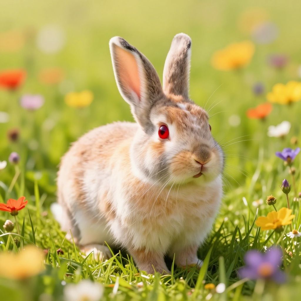 Bunnys with red eyes hopping through a vibrant meadow filled with colorful wildflowers, bright sunlight, realistic fur detail, joyful and whimsical atmosphere
