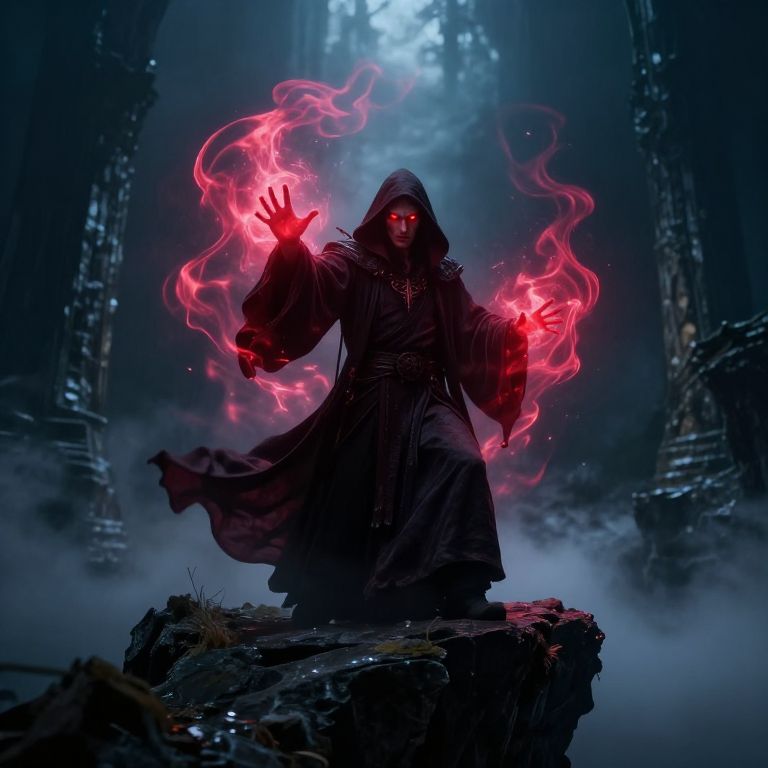 Red-eyed enigmatic sorcerer standing on cliff edge, casting a powerful spell with eyes glowing red, swirling magical energy surrounding him, dark fantasy environment with mist and ancient ruins, cinematic lighting