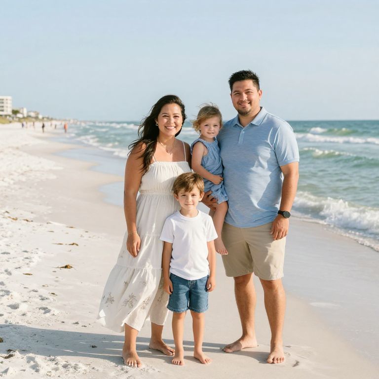 Family of four enjoying a sunny day at the beach, with the Gulf Shores shoreline and gentle waves in the background, capturing the essence of lifestyle portraits by Destin Beach Photographers.