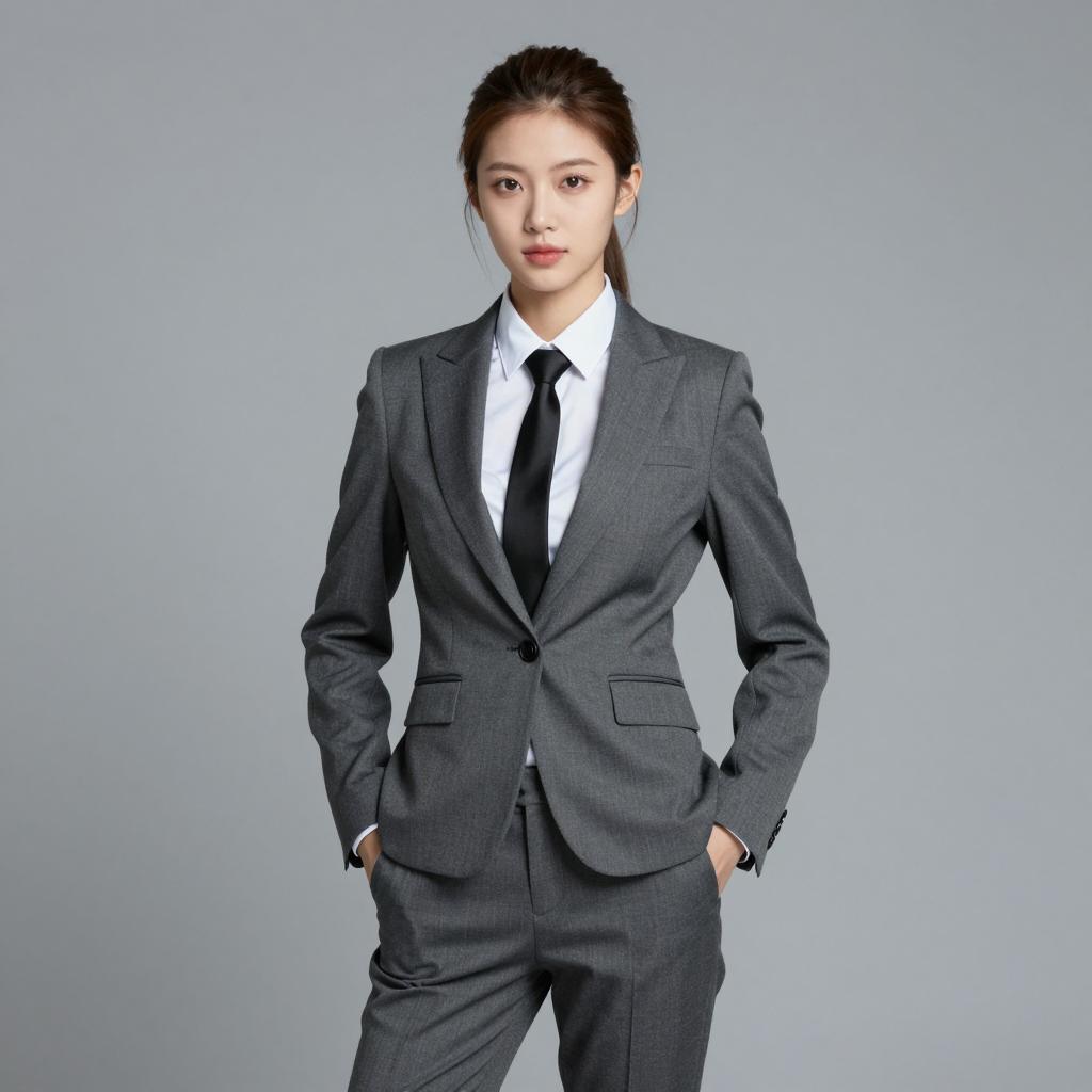 Portrait of a confident young East Asian woman with brown hair tied back in a ponytail, wearing a formal grey suit with matching pants, a white collared shirt, and a black necktie. She is posing with her hands in her pockets against a plain grey background, looking directly at the viewer with a serious expression.