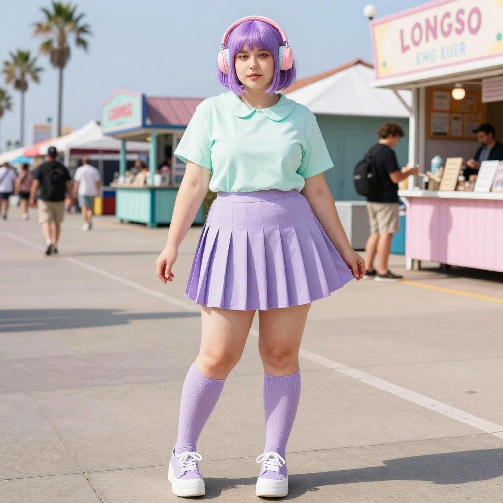 A curvy woman in kawaii style, wearing a pastel mint green Peter Pan collar t-shirt, lavender pleated mini skirt, knee-high pastel purple socks, and lavender platform sneakers, oversized pastel pink headphones perched on her short lilac wig with bangs, stands at a fashionable boardwalk in Long Beach, surrounded by vibrant beachgoers and colorful stalls. Sexy. Pretty face and beutiful eyes