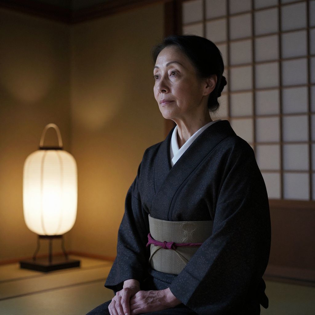 Photograph of an older East Asian woman in a black kimono with a brown obi, sitting in a dimly lit traditional Japanese room, illuminated
