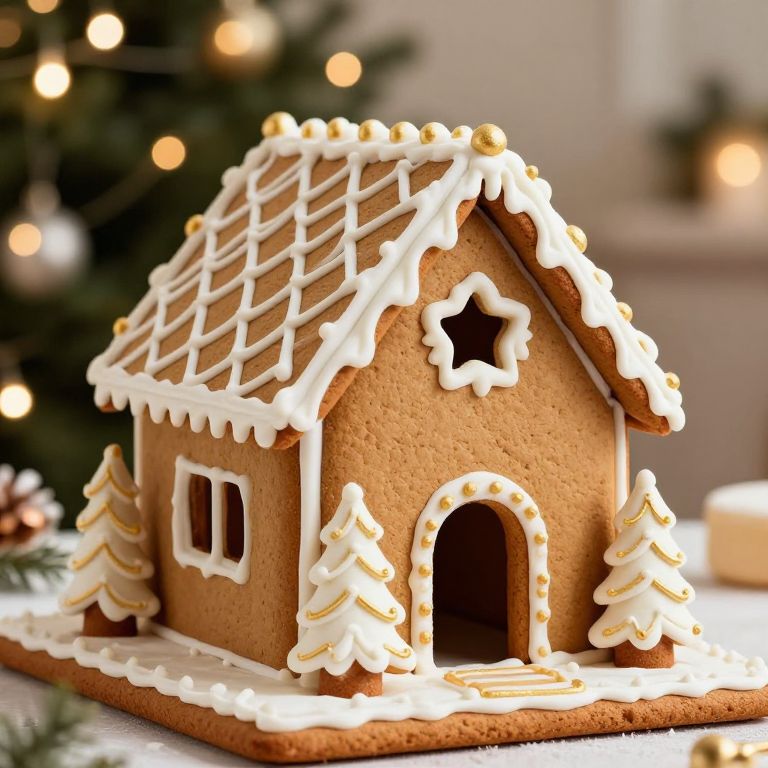 Gingerbread house crafted with gluten-free ingredients, adorned in intricate white icing details and golden accents, featuring two festive Christmas trees and a star window decoration, set against a backdrop of twinkling holiday lights.