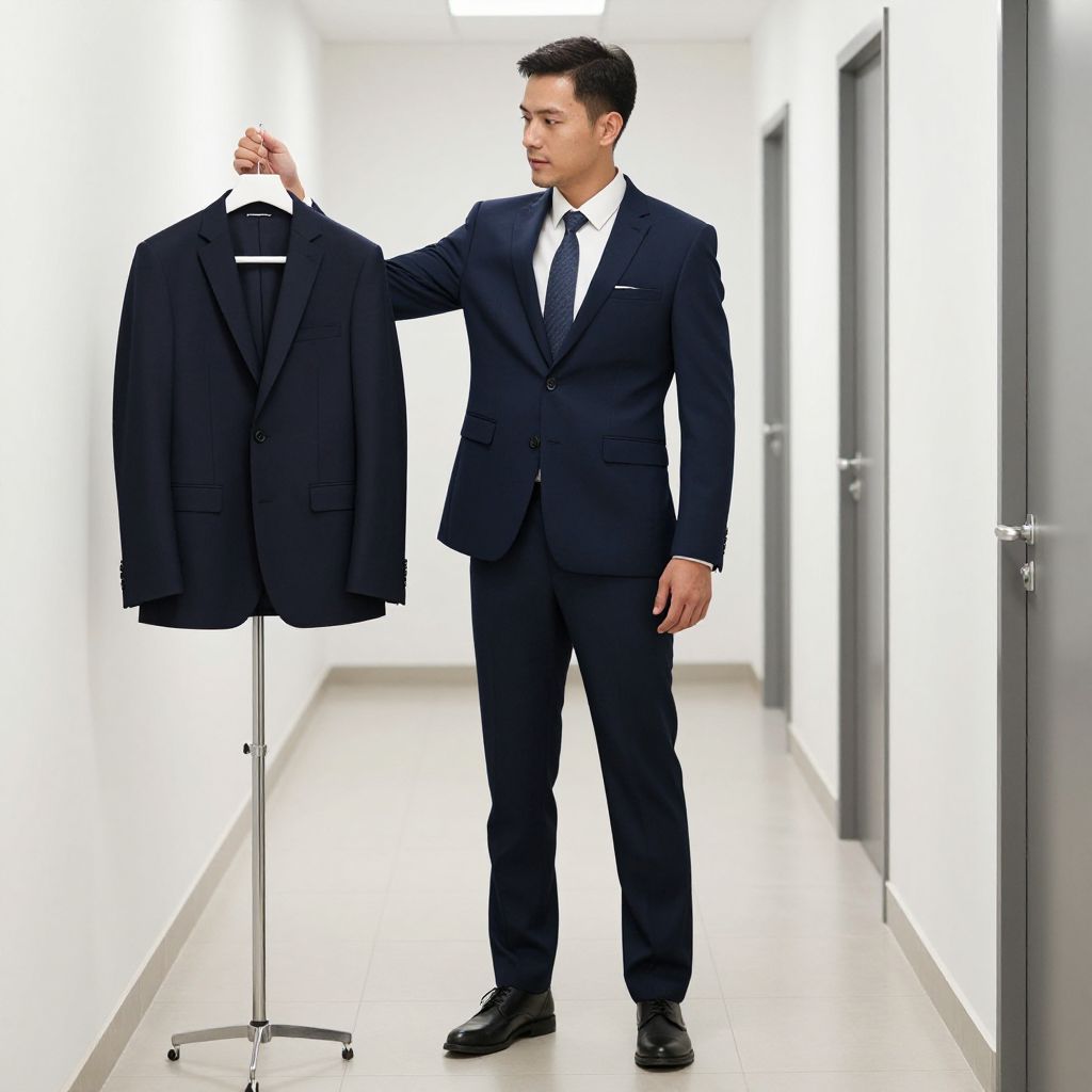 Office Cloth Costume, man in a suit standing in a hallway with a suit on