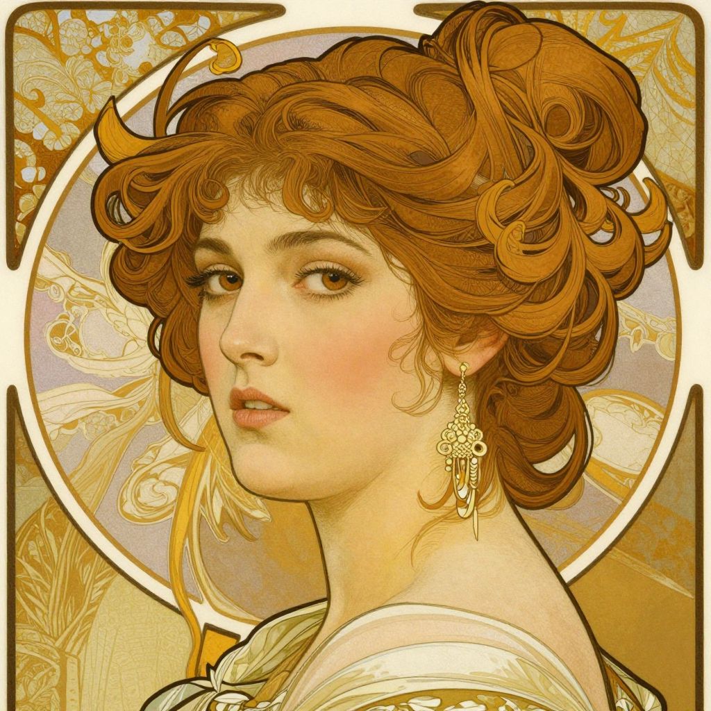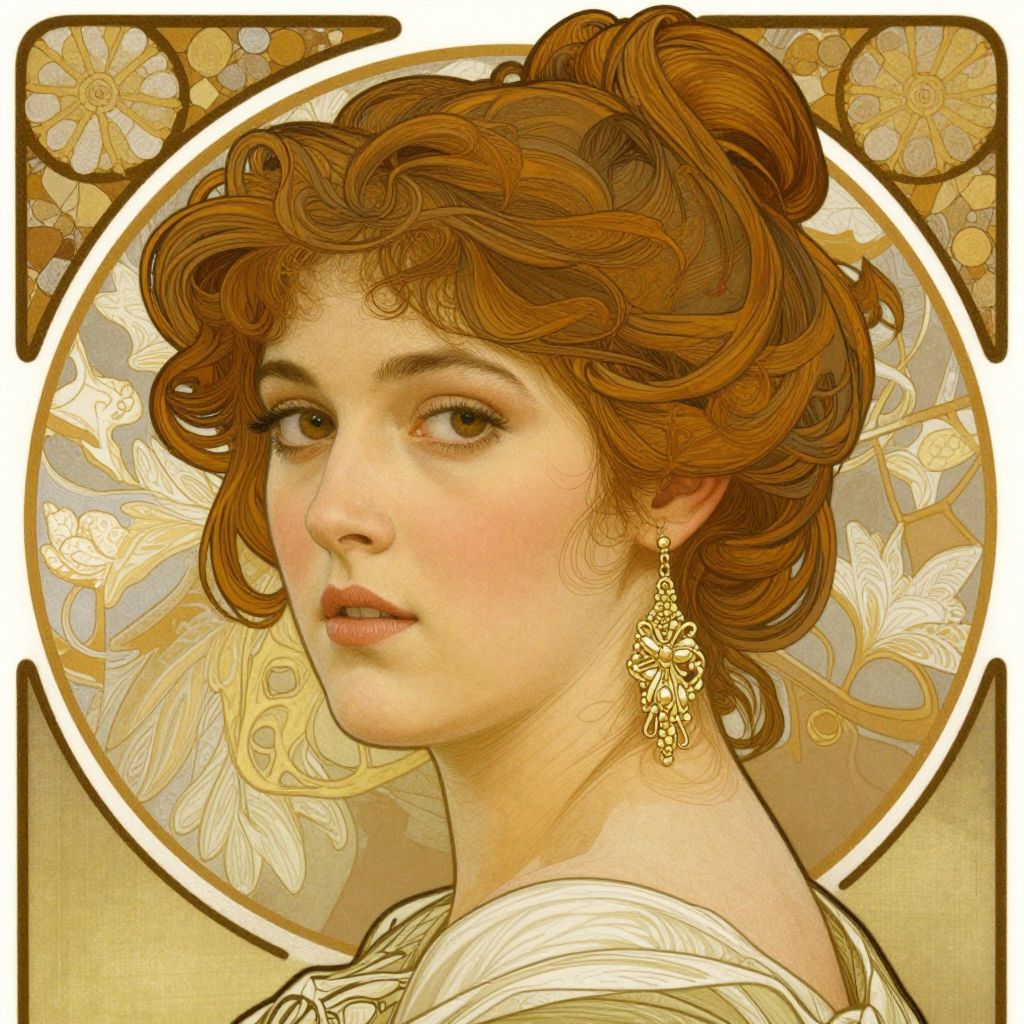 A finely detailed digital portrait inspired by Art Nouveau aesthetics, featuring a woman with elegantly styled hair and a delicate earring, rendered in high-definition realism reminiscent of Alphonse Marie Mucha's style.