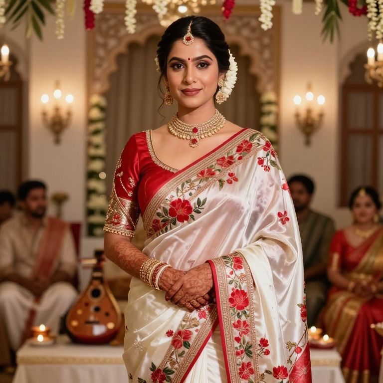 A graceful Indian bride-to-be with smooth fair skin, high forehead, and a poised expression is dressed in a luxurious handcrafted silk saree with floral motifs in crimson and white, attending a formal engagement function in a grand heritage-style wedding hall with candles, jasmine flowers, and traditional Indian music playing in the background.