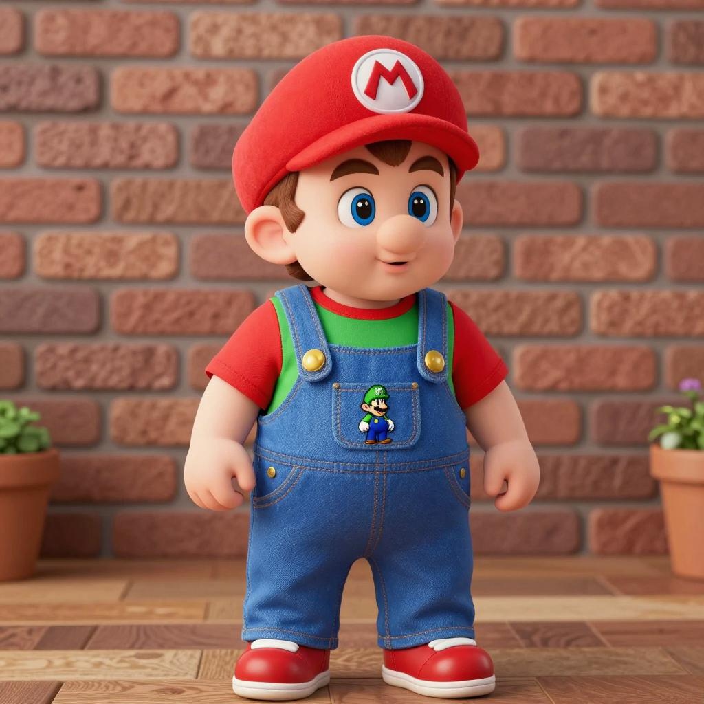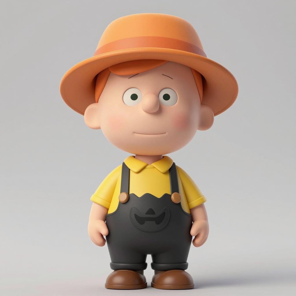 Charlie brown lucy halloween, digital doll, realistic style, photorealistic, cute baby boy, light skin, bright orange hair, small side part, big round green eyes, slightly chubby cheeks, wearing yellow short-sleeved shirt, black overalls, orange wide-brimmed hat, neutral grey background, standing pose, front view, soft lighting, subtle shadows, realistic ures, detailed facial features, realistic clothing, toy-like appearance, subtle 3D effect, slight color gradient background