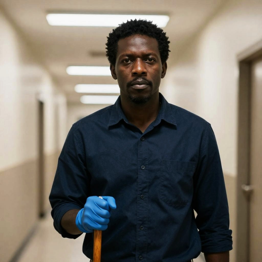 African American man with short, curly hair and a serious expression, wearing a dark blue shirt and blue gloves, holds a wooden cane with his right hand. He is in a dimly lit, beige hallway with white walls and fluorescent lights.