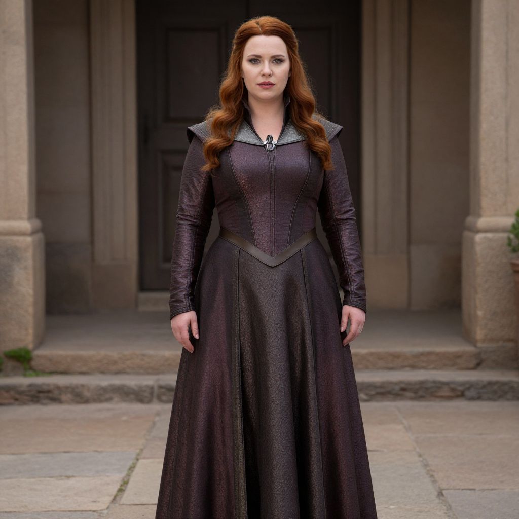 Plus Size Agatha Harkness Costume, woman in medieval dress standing in front of a building