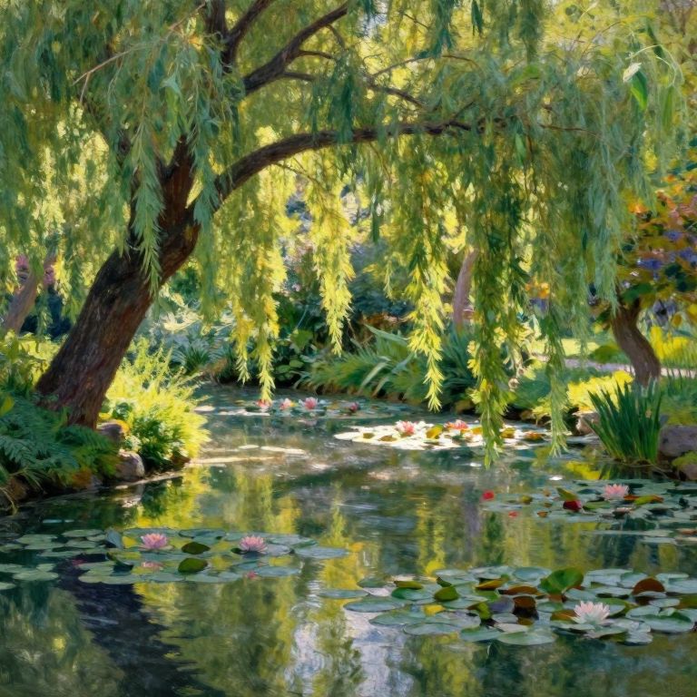 Imagine an enchanting garden landscape in an impressionistic style reminiscent of Monet's famed \"Water Lilies\" series. A grand willow tree arches gracefully over a tranquil pond, its leaves creating intricate patterns of light and shadow that dance across the water. From an elevated perspective, observe this idyllic scene as if seen through a soft-focused lens, with diffused sunlight casting a warm glow upon the lush surroundings. This dreamlike image captures the serene beauty of nature while invoking a sense of introspection and tranquility, inviting viewers to lose themselves in the harmonious blend of colors and the soothing atmosphere that blurs the boundaries between reality and imagination.