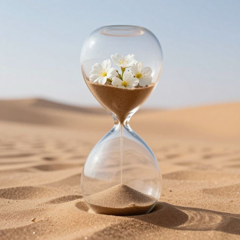 In a serene desert landscape, an hourglass defies convention by cradling a delicate cluster of white flowers where sand would normally fall, symbolizing the unexpected blossoming of beauty within the passage of time.