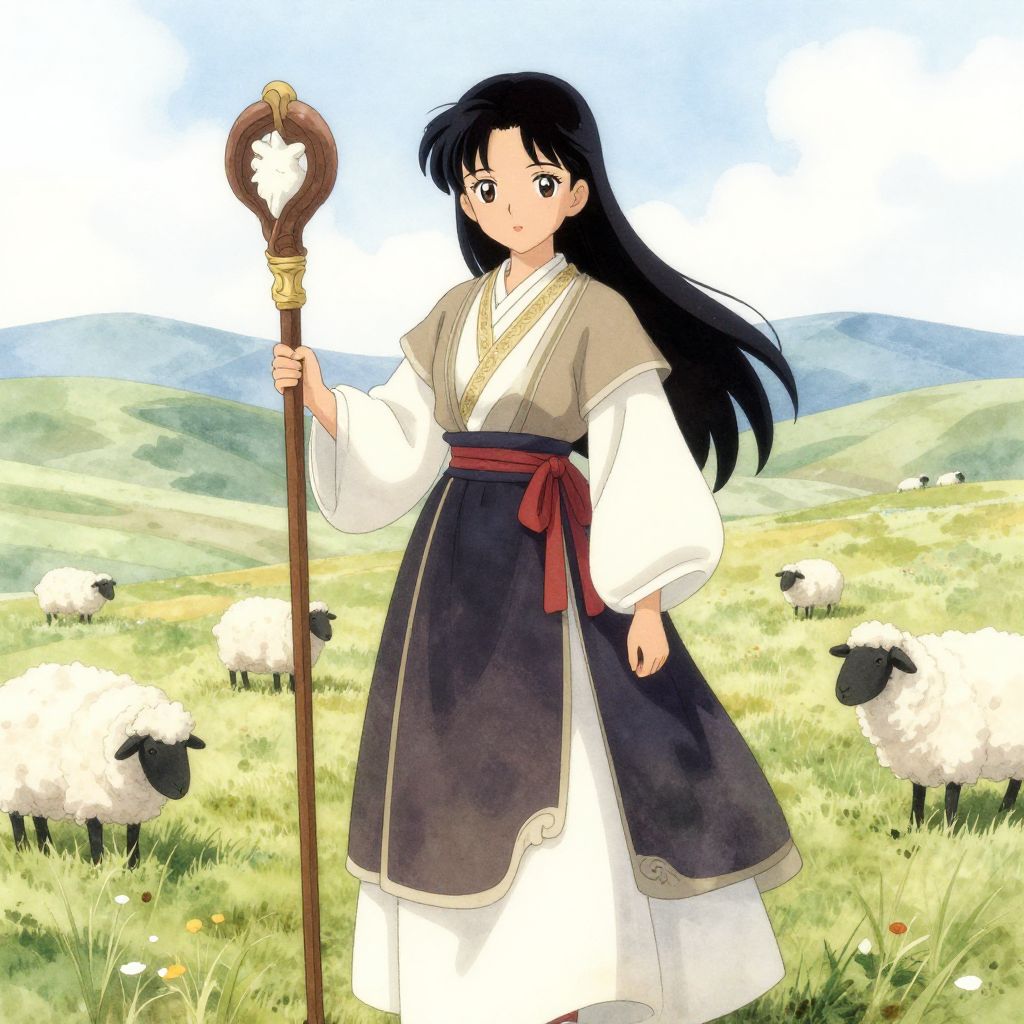 Majestic sheep anime girl in traditional pastoral clothing, holding a shepherd’s staff, surrounded by rolling hills and grazing sheep, soft watercolor textures, elegant anime styling