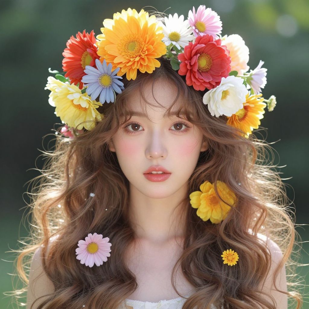 A luminous young woman adorned with vibrant, oversized flowers woven into her cascading locks, defying the boundaries of nature and reality in a dreamlike, ethereal portrait.