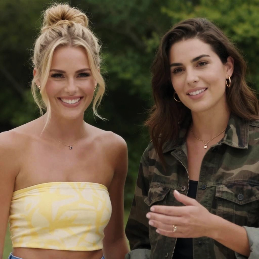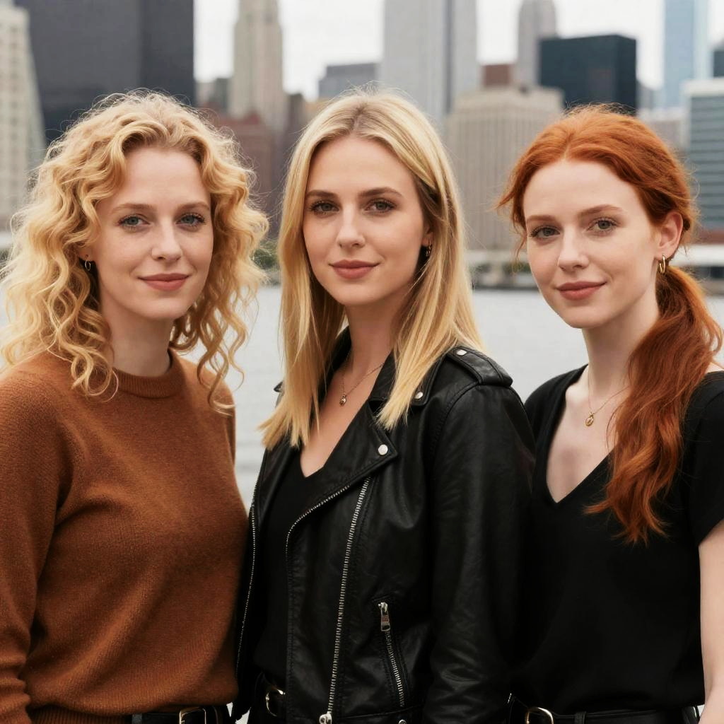 Photograph of three women with vibrant backgrounds. Blonde woman in center with long hair, smiling, wearing patterned top. Dark-haired woman on left with short hair, smiling, wearing black sleeveless top. Brunette woman on right with wavy hair, subtle smile, wearing patterned top. Warm red and purple background. Women close together, shoulders touching.