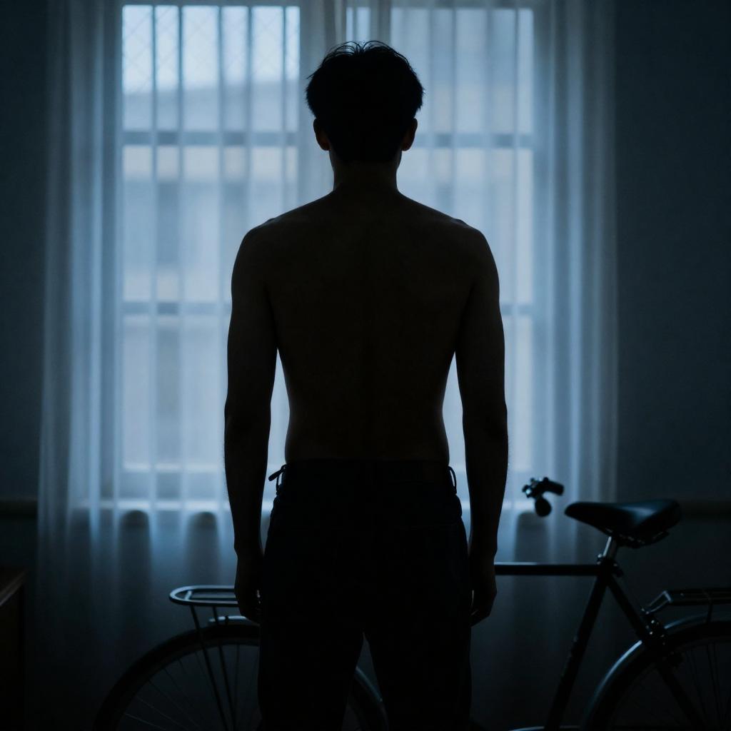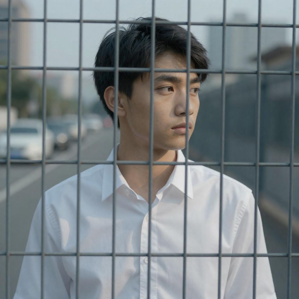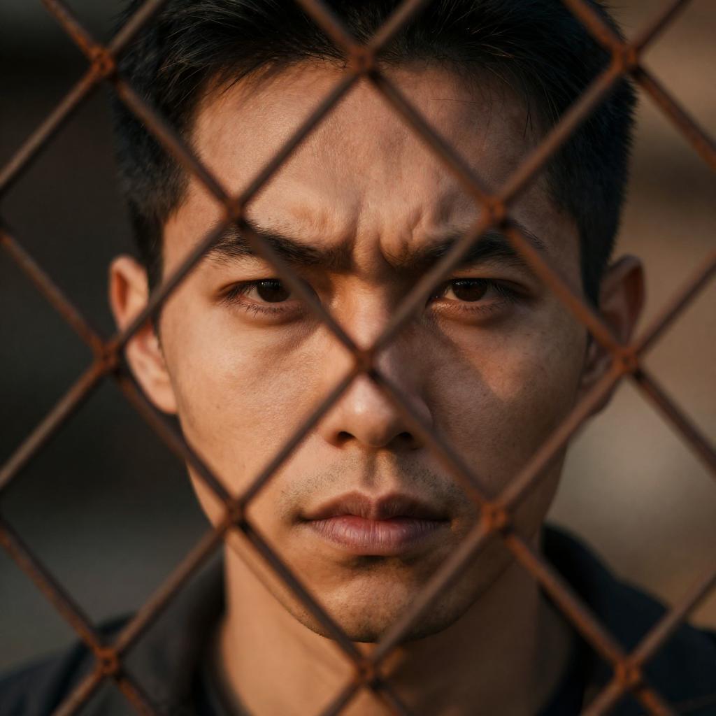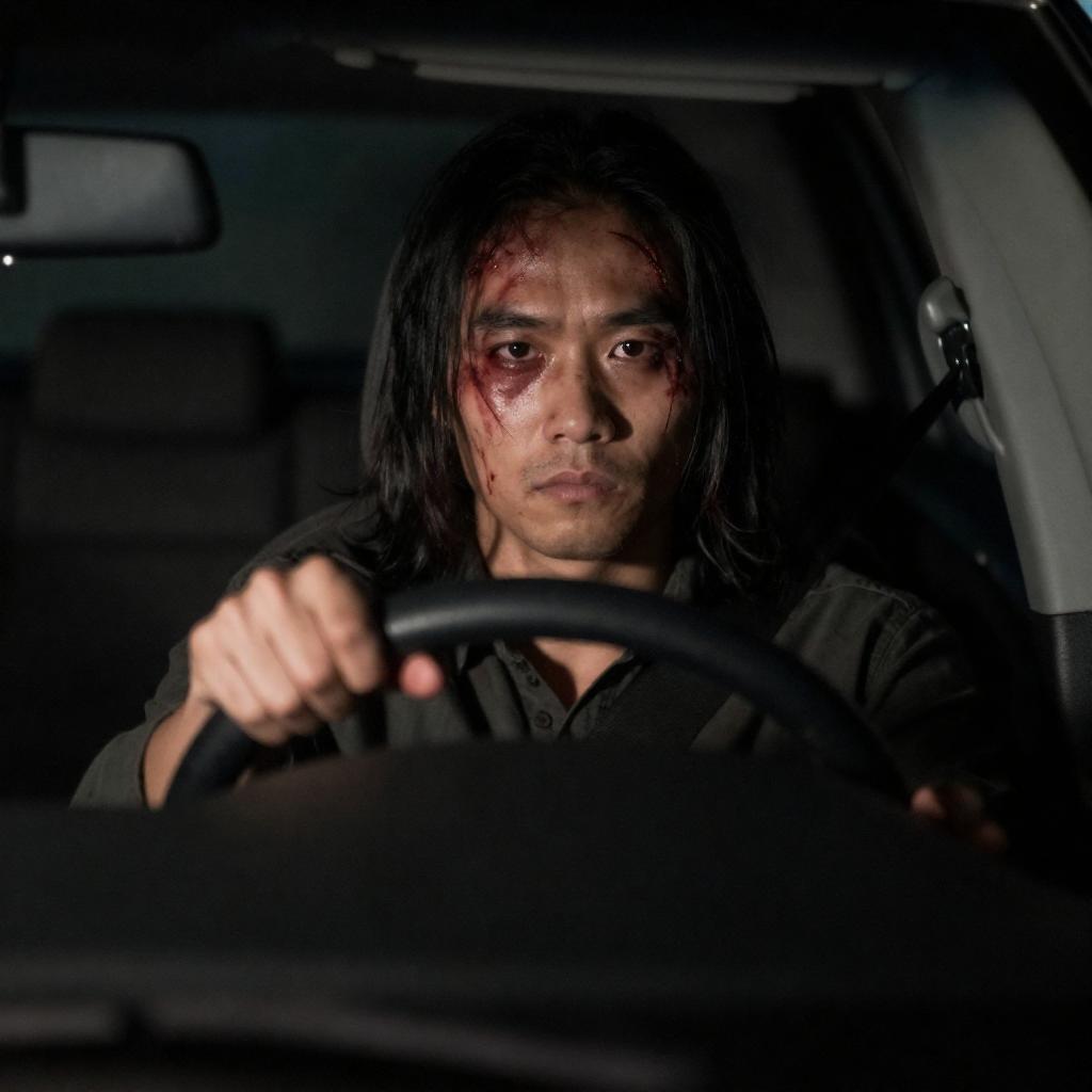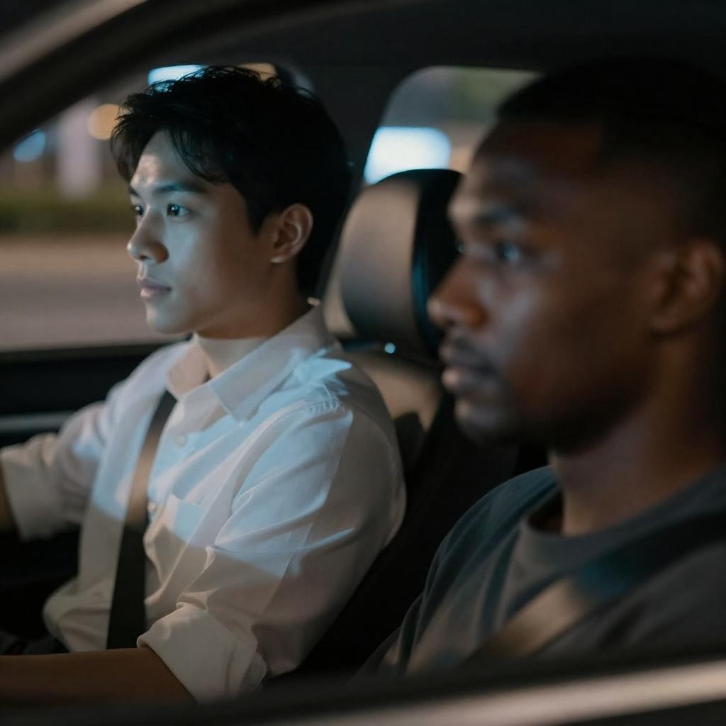 Photograph of a car's rearview mirror at night, showing a person's intense, orange-lit eyes peering through the glass. The background is dark with a faint green light on the right. Raindrops cover the car's surface, adding ure. The person's expression is focused and slightly mysterious.