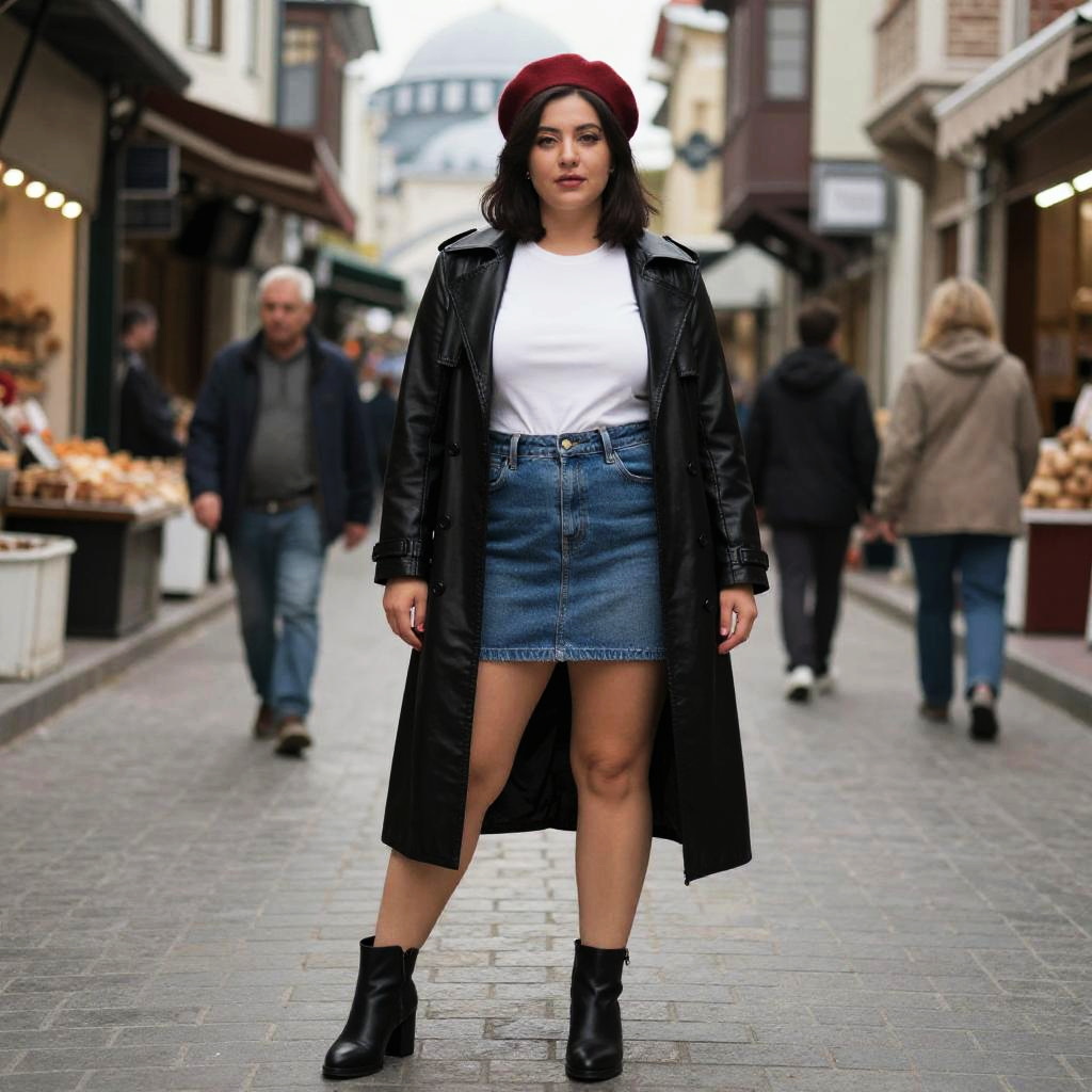 A curvy woman in a daguerreotype film style, wearing a black faux leather trench coat over a white t-shirt and a high-waisted denim mini skirt, paired with black ankle boots and a red beret, poses in a historic street in Istanbul with bustling markets. Sexy. Pretty face and beаutiful eyes. Big breasts