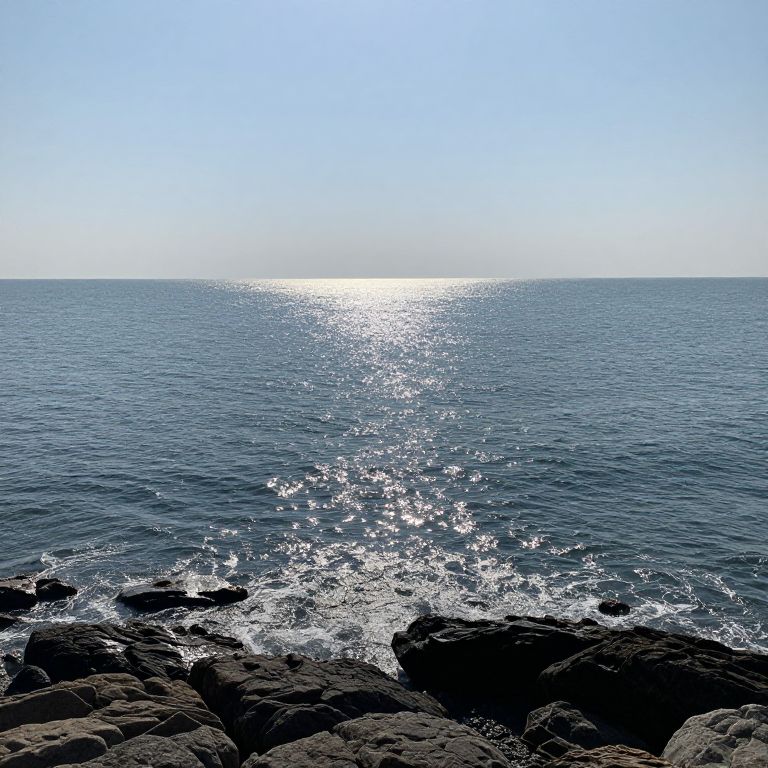 Where sky meets sea, a mirror of infinite depths invites introspection, its surface shimmering with the whispers of freedom and the weight of solitude, while beneath, the silent realm of rocks cradles secrets untold.