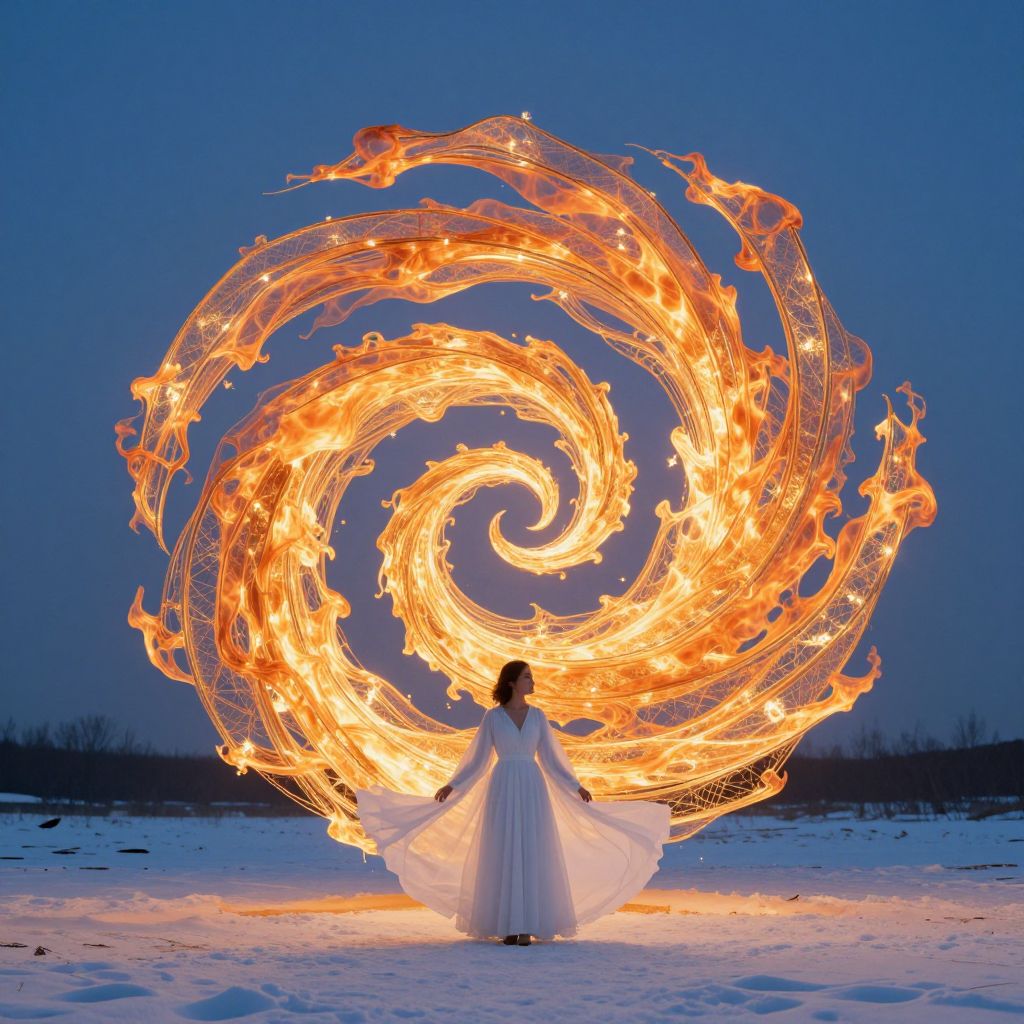 A woman in a flowing white gown stands before a luminous, swirling sculpture of fiery orange and gold waves, its intricate lattice of light hovering above the snow-covered ground as if suspended between earth and sky.
