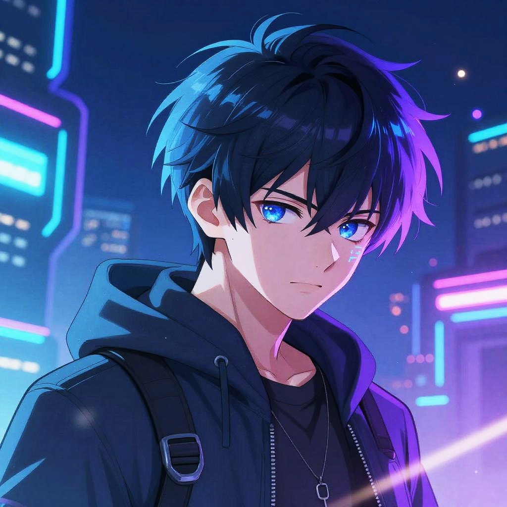 Anime boy with black hair and blue eyes riding a futuristic motorcycle through a cyberpunk city at night, rain droplets, glowing neon signs, dynamic motion blur, highly detailed and stylized anime illustration with sharp contrasts.