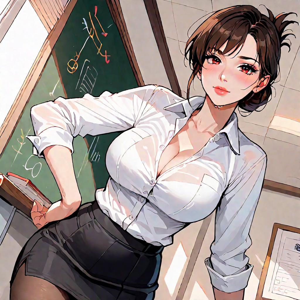 Score_4, score_5, score_6, score_9, score_8_up, score_7_up, general, solo, source_anime, brown eyes, brown hair, short hair, folded ponytail, large breasts, collared shirt, cleavage, white shirt, pencil skirt, black skirt, black pantyhose, office lady, standing, hand own hip, cowboy shot, looking at viewer, dutch angle, blush, light smile, indoors, room, classroom