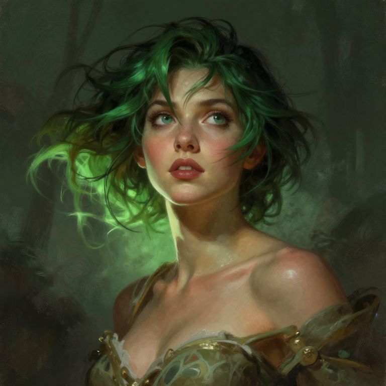 Rayon female character design, portrait, olive skin, forest green short hair, androgynous, fantasy, D&D, dynamic lighting painted by artgerm, Alphonse mucha, low angle shot, digital painting,