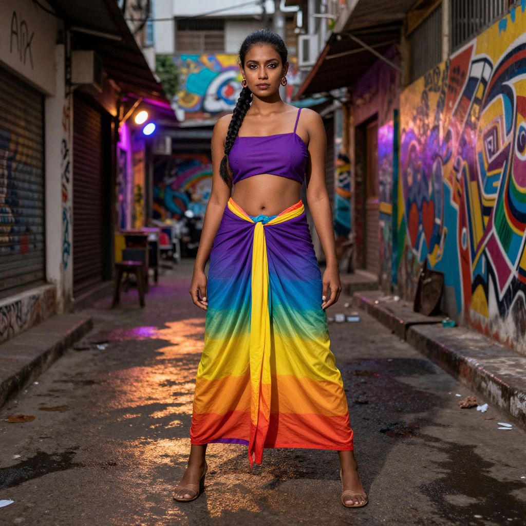 A bold, modern South Asian woman with deep brown skin, braided hair, and a confident expression wears a colorful rainbow sarong with a gradient from violet to yellow, posing in a vibrant urban street art alley in Chennai, with graffiti walls and colorful lights behind her, casting dramatic shadows on the wet pavement.