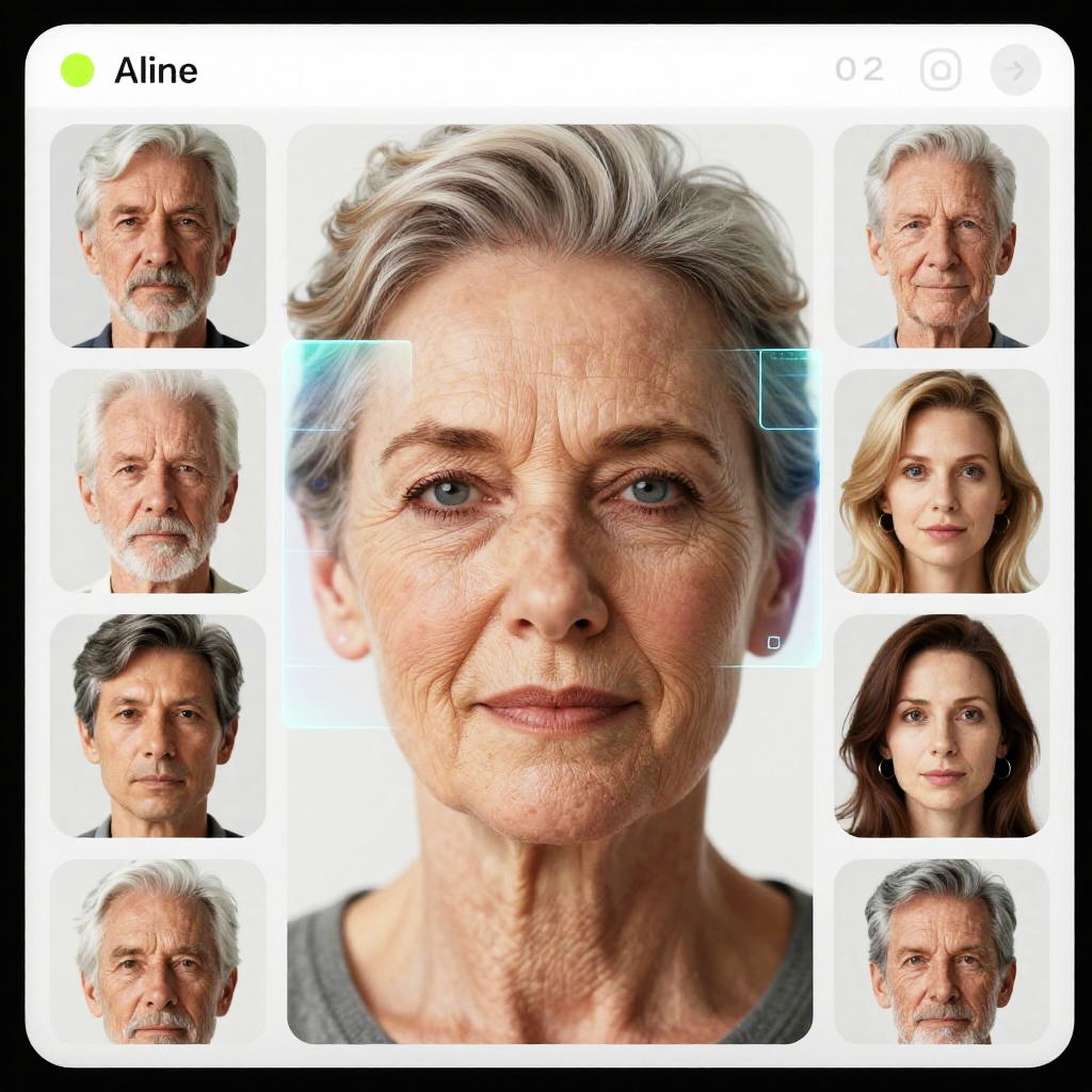 Face aging online generator visualization, close-up of diverse faces seamlessly aging via digital filters, holographic effects, bright touchscreen panels, modern app interface, detailed wrinkles and hair color changes, sleek cyber aesthetics, high resolution