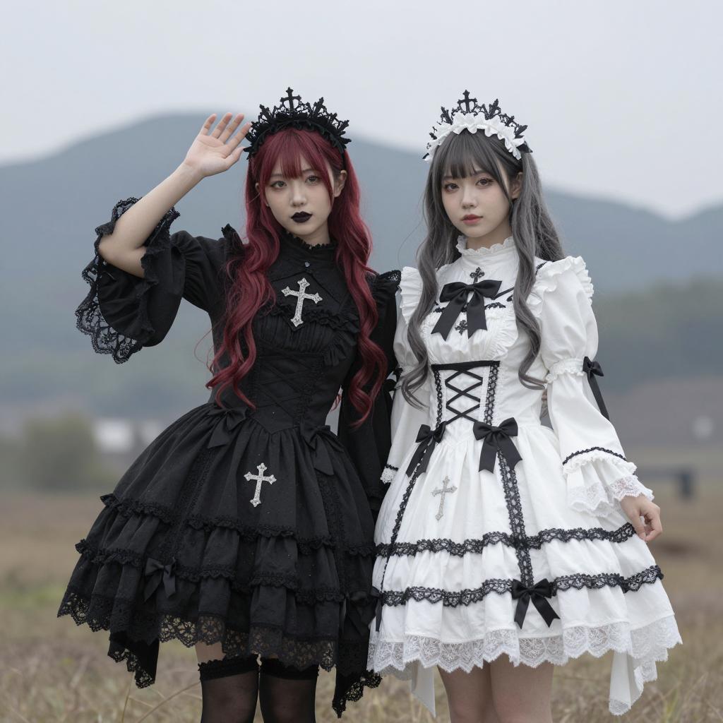 Two young women with pale skin and dark hair in pigtails, wearing black gothic lolita dresses, fishnet stockings, and platform shoes. The woman on the left holds a bat over her shoulder, the woman on the right holds an umbrella. Both stand on a rooftop with broken concrete and metal structures in the background. The left woman has a black ribbon in her hair, the right woman has white hair with black ribbons.