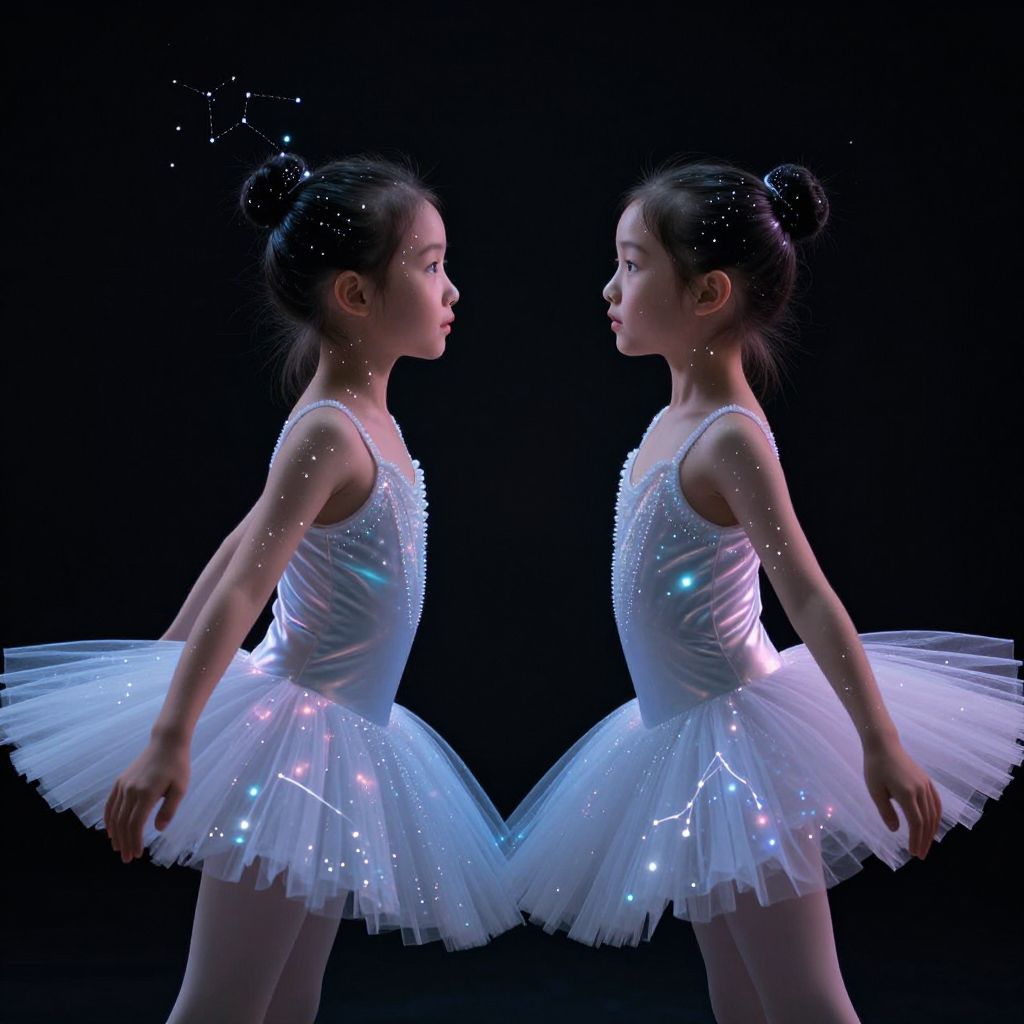 Two ethereal children, adorned in shimmering ballet attire, stand face-to-face against a dark backdrop, their translucent skin revealing intricate constellations that flicker and shift as if responding to the subtle movements of their bodies, embodying a surreal and otherworldly digital art style with a hauntingly beautiful visual effect.